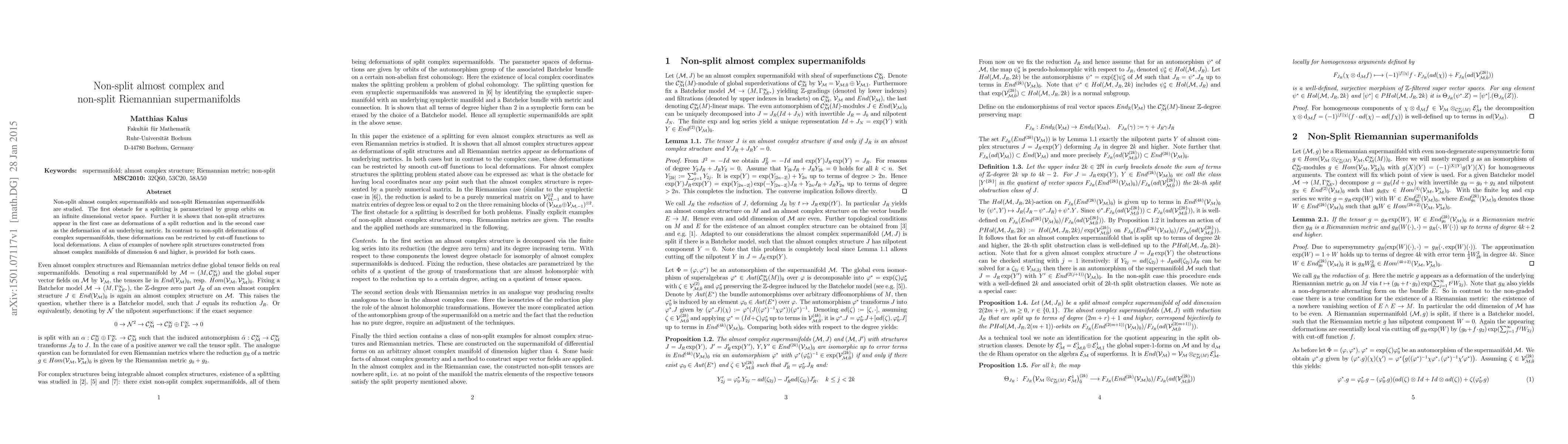 This paper investigates non-split almost complex and non-split Riemannian supermanifolds, revealing that their first splitting obstacles are parametrized by group orbits on an infinite-dimensional vector space. It demonstrates that non-split structures arise from deformations of split reductions and underlying metrics, and introduces examples from almost complex manifolds of dimension 6 and higher.