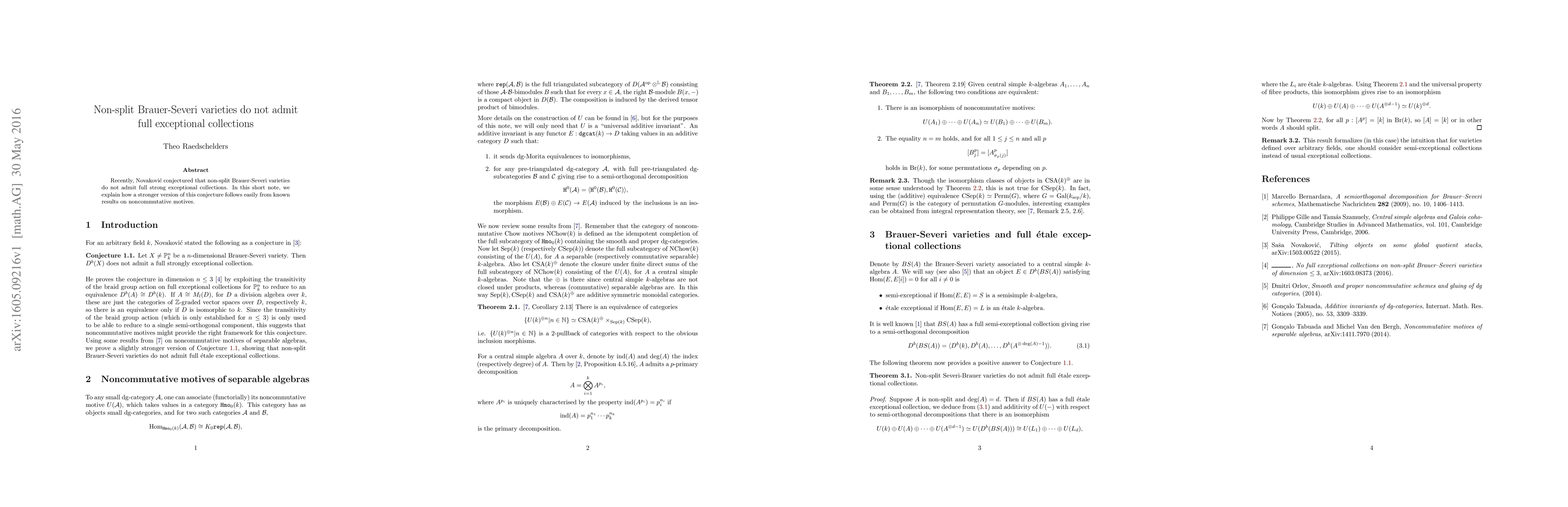 Recently, Novakovi\'c conjectured that non-split Brauer-Severi varieties do not admit full strong exceptional collections. In this short note, we explain how a stronger version of this conjecture follows easily from known results on noncommutative motives.