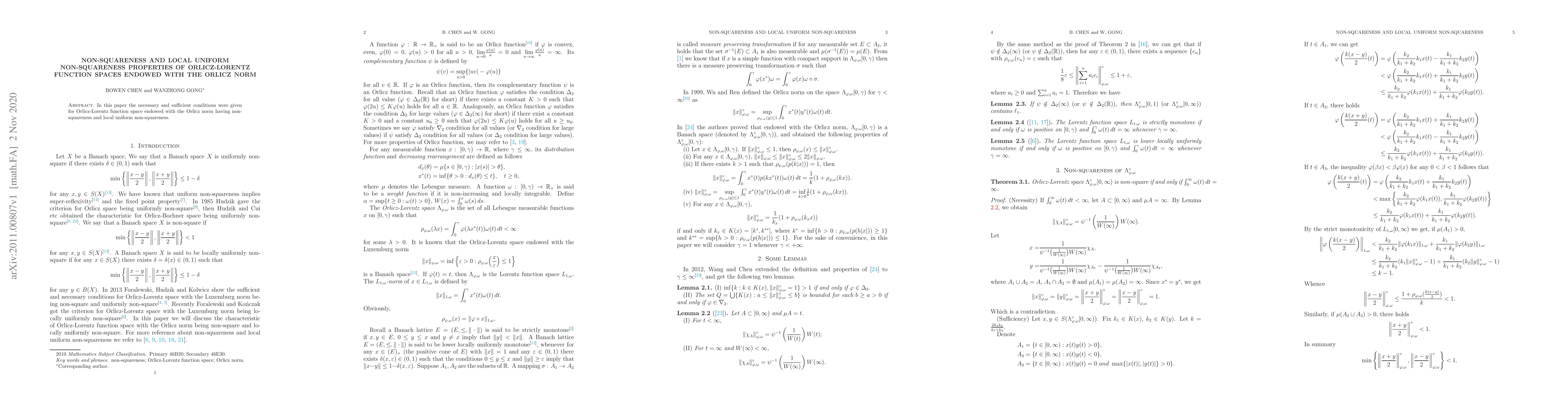 In this paper the necessary and sufficient conditions were given for Orlicz-Lorentz function space endowed with the Orlicz norm having non-squareness and local uniform non-squareness.