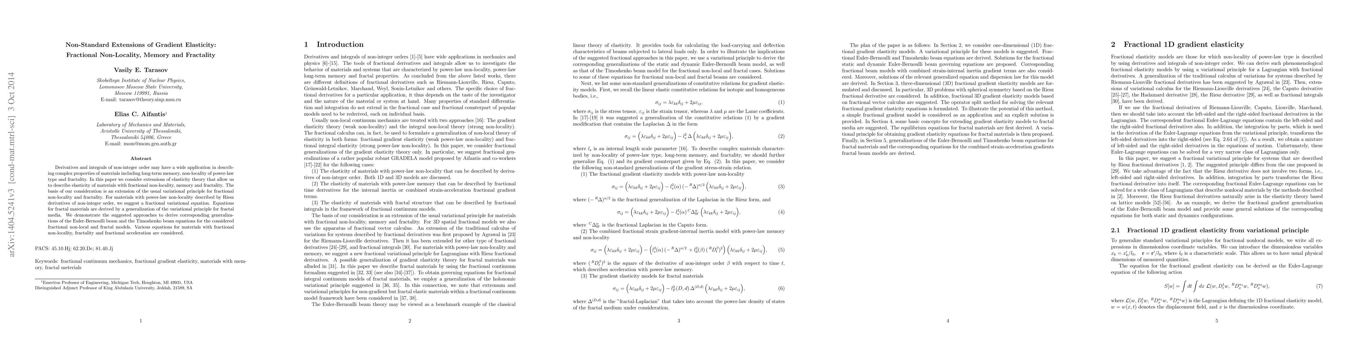 This paper extends elasticity theory to include fractional non-locality, memory, and fractality using derivatives and integrals of non-integer order. It proposes fractional variational equations for power-law non-local materials and generalizes the variational principle for fractal media, deriving generalized Euler-Bernoulli and Timoshenko beam equations for these models.