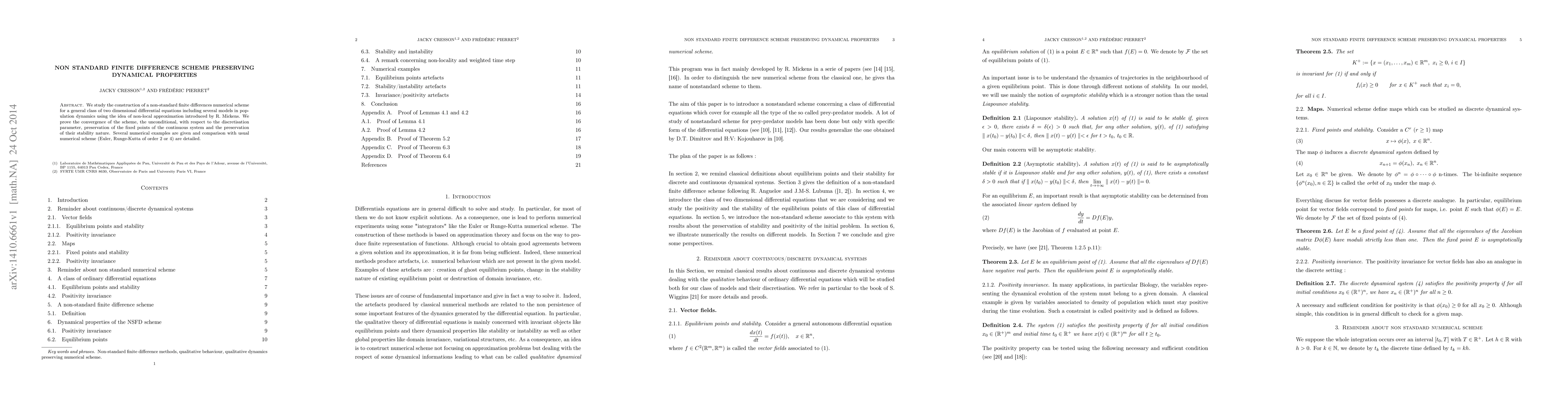 This paper develops a non-standard finite difference scheme for two-dimensional differential equations, particularly in population dynamics, ensuring convergence and preservation of fixed points and stability. Numerical examples compare this new scheme with traditional methods like Euler and Runge-Kutta methods.