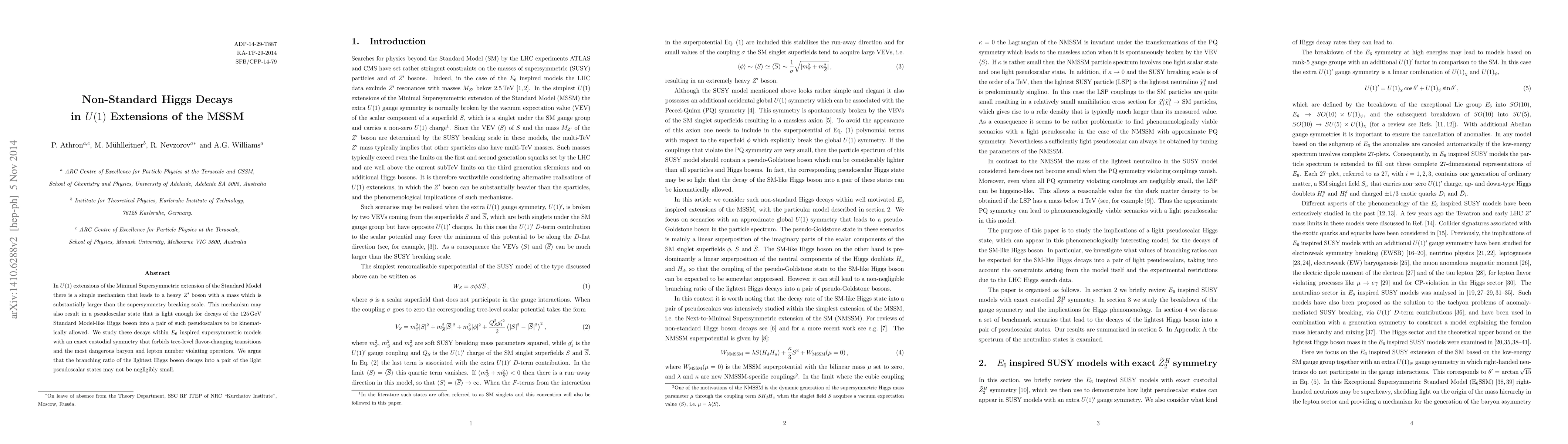 This paper explores non-standard Higgs decays in U(1) extensions of the MSSM, focusing on models where a heavy Z' boson and a light pseudoscalar state allow for the 125 GeV Higgs to decay into pairs of these pseudoscalars. It argues that the branching ratio for such decays may be significant, particularly in E6-inspired models with custodial symmetry.