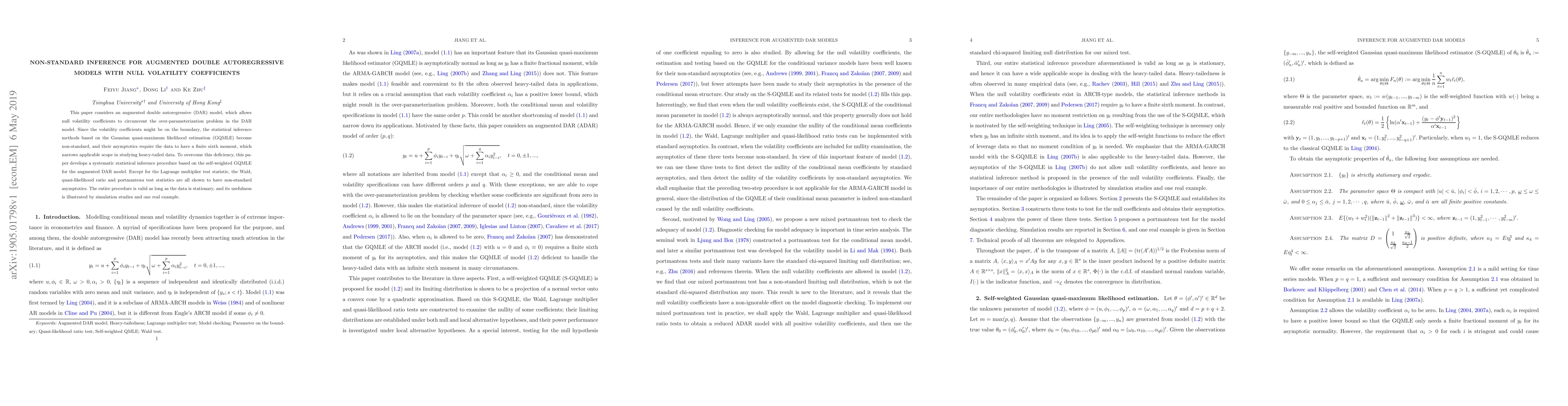 This paper develops a statistical inference procedure for augmented double autoregressive models with null volatility coefficients, addressing non-standard asymptotics due to boundary conditions. It introduces a self-weighted GQMLE approach, validated through simulations and a real-world example.