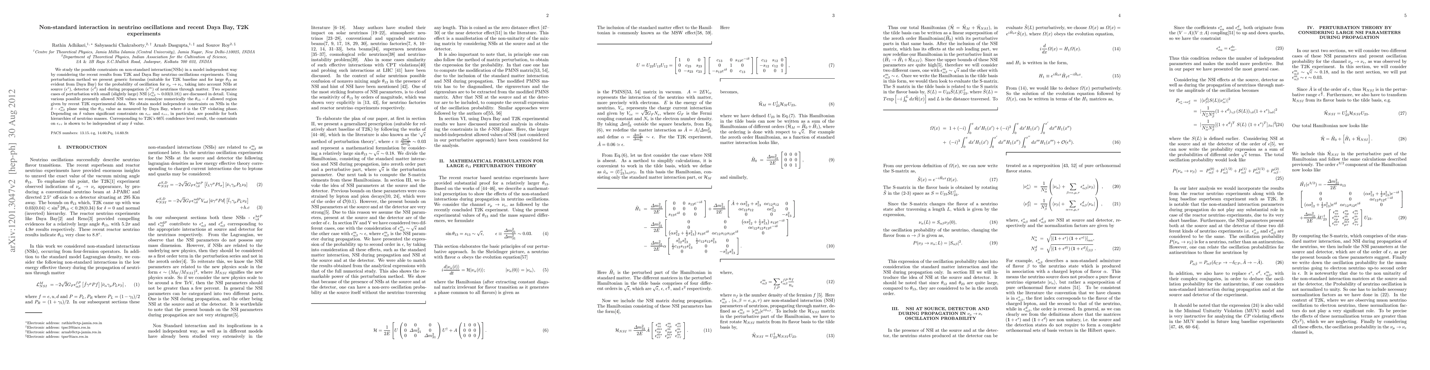 This paper investigates non-standard interactions (NSIs) in neutrino oscillations using recent T2K and Daya Bay experimental data. It presents model-independent constraints on NSIs in the $\delta-\epsilon_{\alpha\beta}^m$ plane, revealing significant limits on $\epsilon_{e\tau}$ and $\epsilon_{\tau\tau}$ for different neutrino mass hierarchies, with $\epsilon_{\tau\tau}$ constraints independent of the CP-violating phase $\delta$.