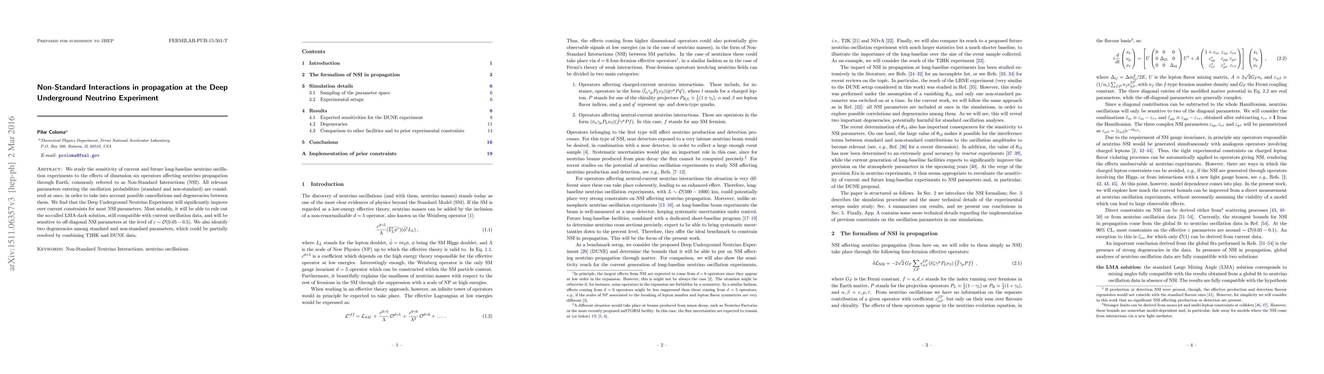 We study the sensitivity of current and future long-baseline neutrino oscillation experiments to the effects of dimension six operators affecting neutrino propagation through Earth, commonly referred to as Non-Standard Interactions (NSI). All relevant parameters entering the oscillation probabilities (standard and non-standard) are considered at once, in order to take into account possible cancellations and degeneracies between them. We find that the Deep Underground Neutrino Experiment will significantly improve over current constraints for most NSI parameters. Most notably, it will be able to rule out the so-called LMA-dark solution, still compatible with current oscillation data, and will be sensitive to off-diagonal NSI parameters at the level of $\varepsilon \sim \mathcal{O}(0.05 - 0.5)$. We also identify two degeneracies among standard and non-standard parameters, which could be partially resolved by combining T2HK and DUNE data.
