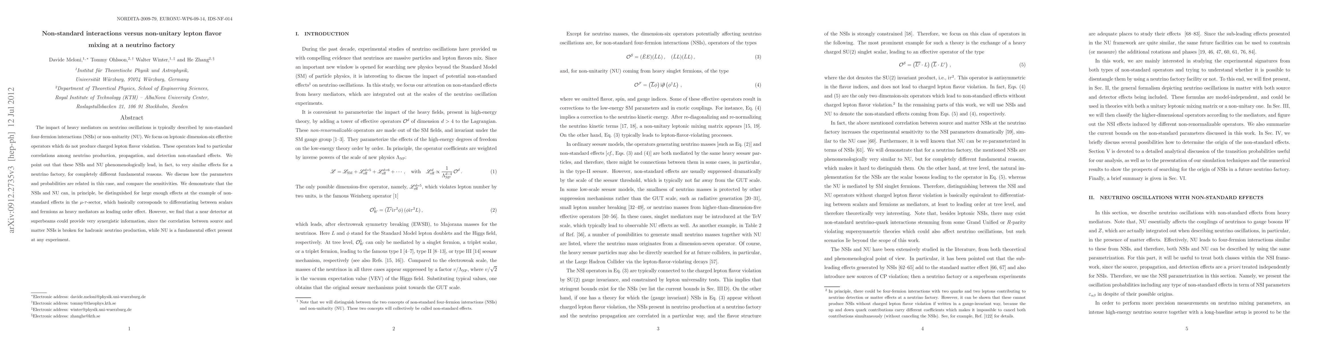 The impact of heavy mediators on neutrino oscillations is typically described by non-standard four-fermion interactions (NSIs) or non-unitarity (NU). We focus on leptonic dimension-six effective operators which do not produce charged lepton flavor violation. These operators lead to particular correlations among neutrino production, propagation, and detection non-standard effects. We point out that these NSIs and NU phenomenologically lead, in fact, to very similar effects for a neutrino factory, for completely different fundamental reasons. We discuss how the parameters and probabilities are related in this case, and compare the sensitivities. We demonstrate that the NSIs and NU can, in principle, be distinguished for large enough effects at the example of non-standard effects in the $\mu$-$\tau$-sector, which basically corresponds to differentiating between scalars and fermions as heavy mediators as leading order effect. However, we find that a near detector at superbeams could provide very synergistic information, since the correlation between source and matter NSIs is broken for hadronic neutrino production, while NU is a fundamental effect present at any experiment.