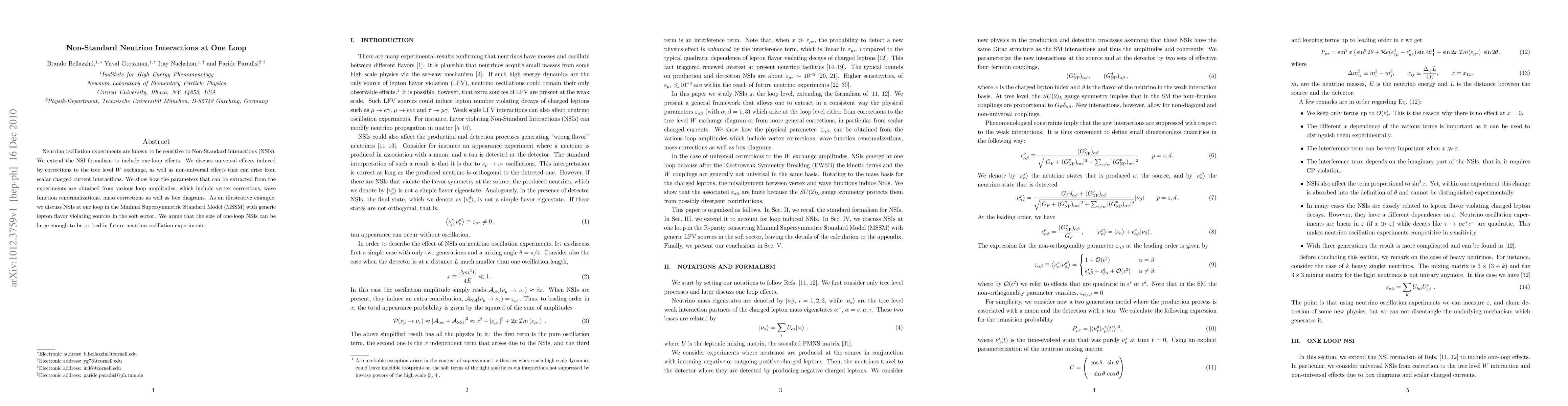 This paper extends the formalism of Non-Standard Interactions (NSIs) to include one-loop effects, discussing both universal and non-universal effects from W exchange and scalar charged current interactions. It highlights the potential for future neutrino oscillation experiments to probe these one-loop NSIs, using the Minimal Supersymmetric Standard Model as an illustrative example.