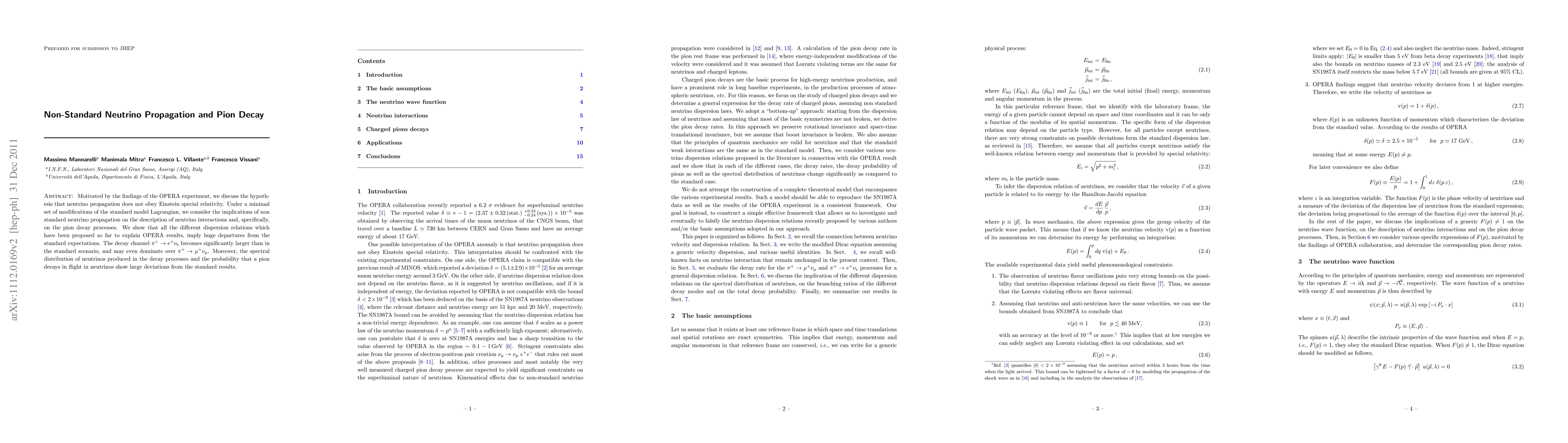 Motivated by the findings of the OPERA experiment, we discuss the hypothesis that neutrino propagation does not obey Einstein special relativity. Under a minimal set of modifications of the standard model Lagrangian, we consider the implications of non standard neutrino propagation on the description of neutrino interactions and, specifically, on the pion decay processes. We show that all the different dispersion relations which have been proposed so far to explain OPERA results, imply huge departures from the standard expectations. The decay channel $\pi^+ \to e^+ \nu_{\rm e}$ becomes significantly larger than in the standard scenario, and may even dominate over $\pi^+ \to \mu^+ \nu_{\rm \mu}$. Moreover, the spectral distribution of neutrinos produced in the decay processes and the probability that a pion decays in flight in neutrinos show large deviations from the standard results.