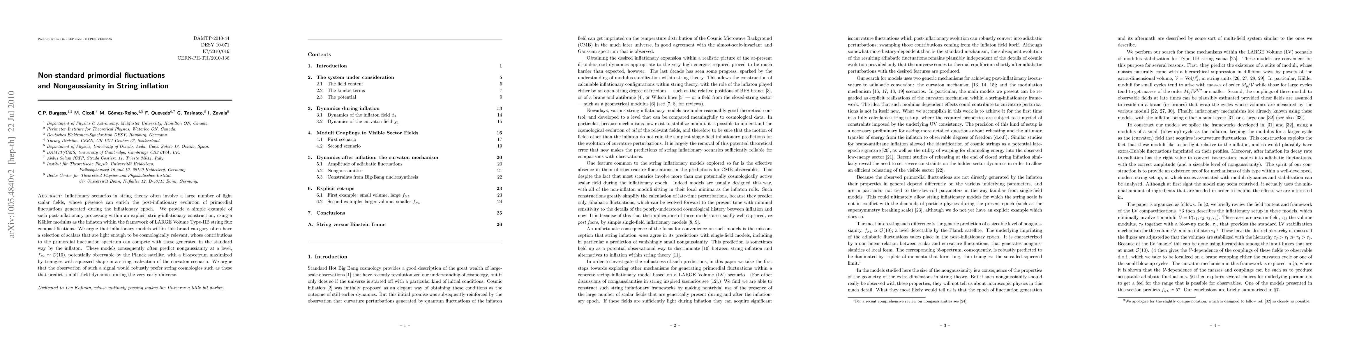 This paper explores inflationary models in string theory with multiple light scalar fields, showing how their contributions can generate nongaussian primordial fluctuations. It predicts observable nongaussianity, with a bi-spectrum maximized for squeezed triangles, potentially detectable by the Planck satellite, supporting multi-field dynamics in early universe string cosmologies.
