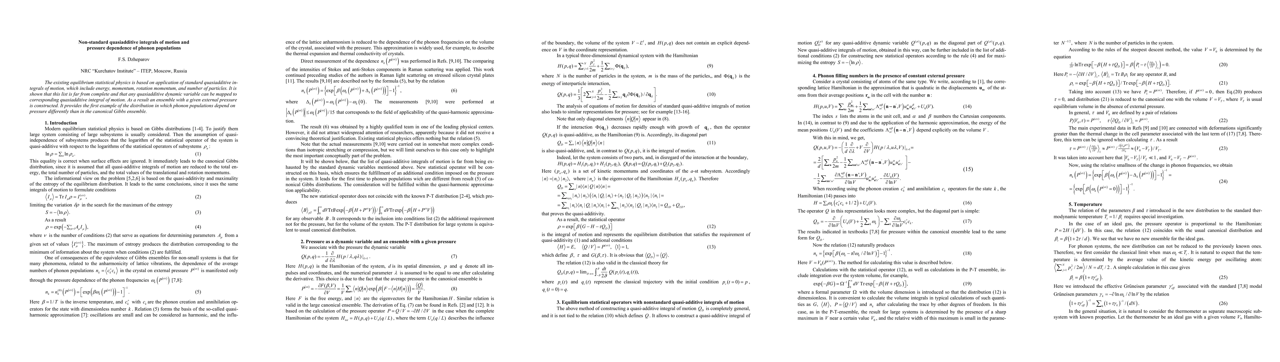 This paper introduces non-standard quasiadditive integrals of motion beyond the conventional energy, momentum, and particle count, proposing a new framework for equilibrium statistical physics. It constructs an ensemble under external pressure where phonon populations vary with pressure differently than in the canonical Gibbs ensemble.