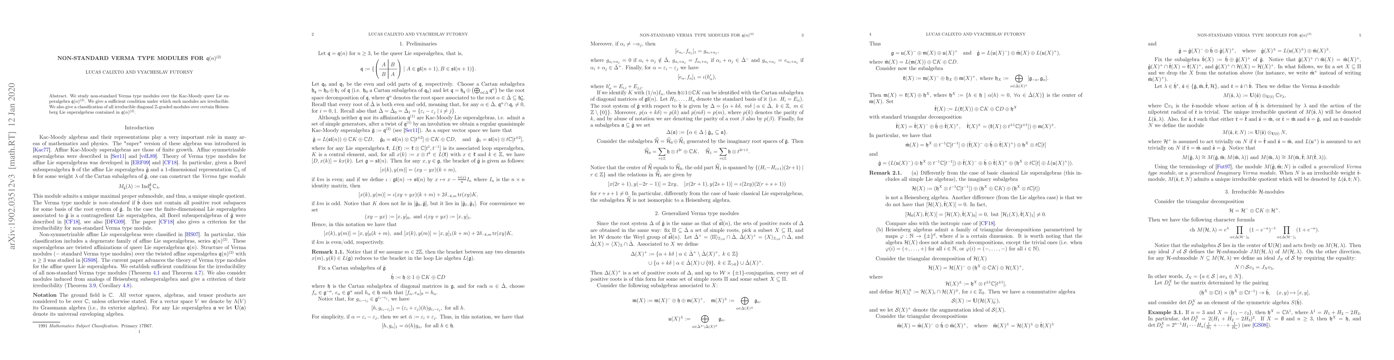 This paper explores non-standard Verma type modules for the queer Lie superalgebra $\mathfrak{q}(n)^{(2)}$, providing a condition for their irreducibility and classifying irreducible diagonal $\mathbb{Z}$-graded modules over certain Heisenberg Lie superalgebras within $\mathfrak{q}(n)^{(2)}$.