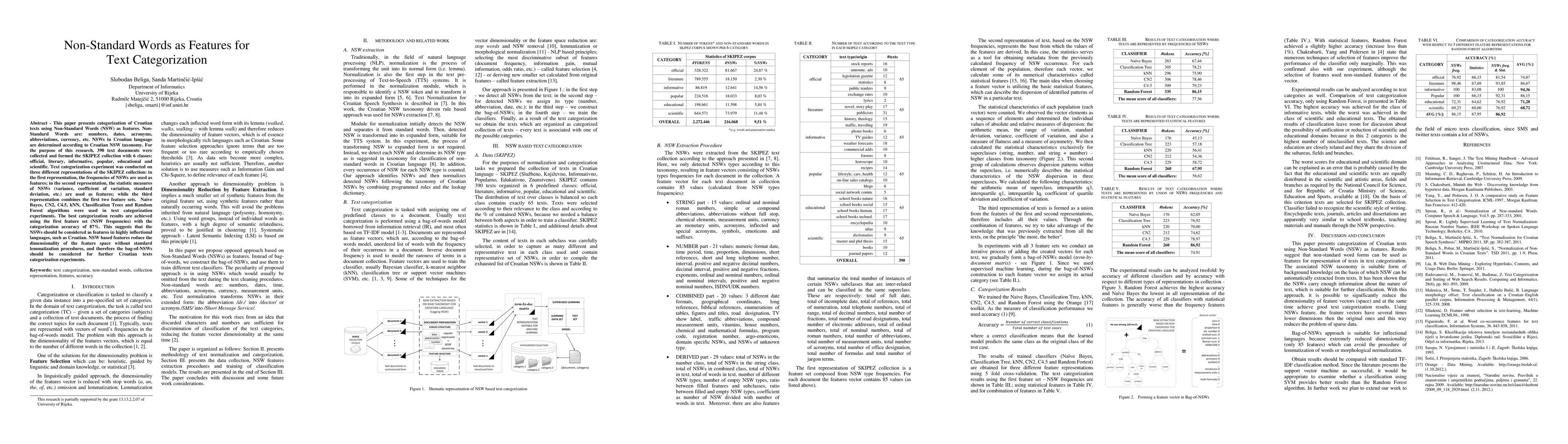 This paper categorizes Croatian texts using Non-Standard Words (NSW) as features, achieving 87% accuracy with NSW frequencies. The study suggests NSWs, including numbers and acronyms, are effective in reducing feature space dimensionality in highly inflectional languages like Croatian.