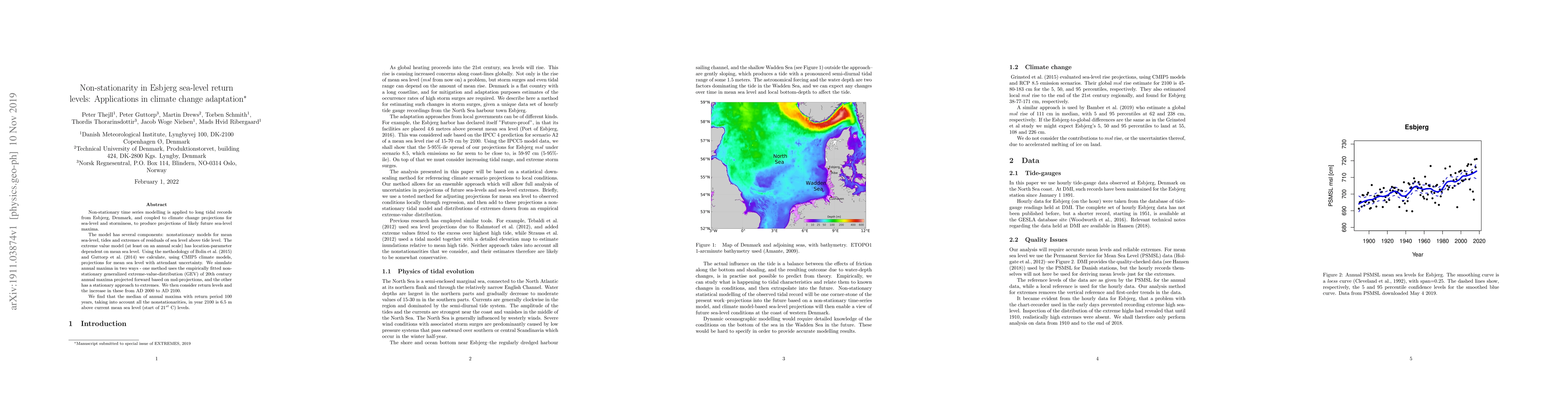 This paper applies non-stationary time series models to Esbjerg's tidal records to project future sea-level maxima under climate change, finding a median increase of 6.5m for a 100-year return level by 2100, highlighting significant adaptation challenges.
