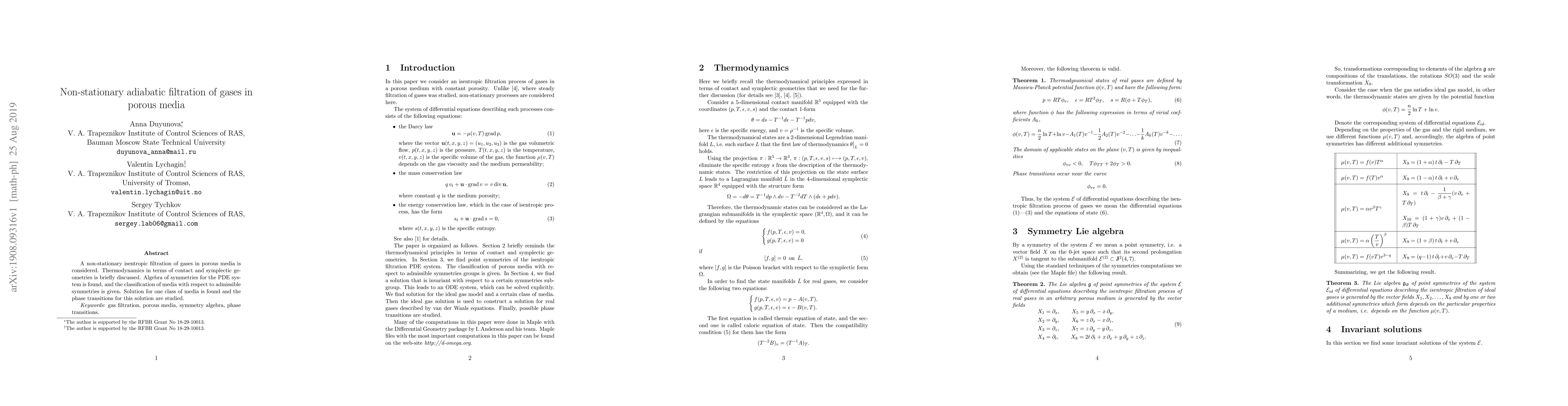 This paper investigates non-stationary adiabatic filtration of gases through porous media, exploring thermodynamics via contact and symplectic geometries. It classifies media based on symmetry algebra and studies phase transitions for a specific media type.