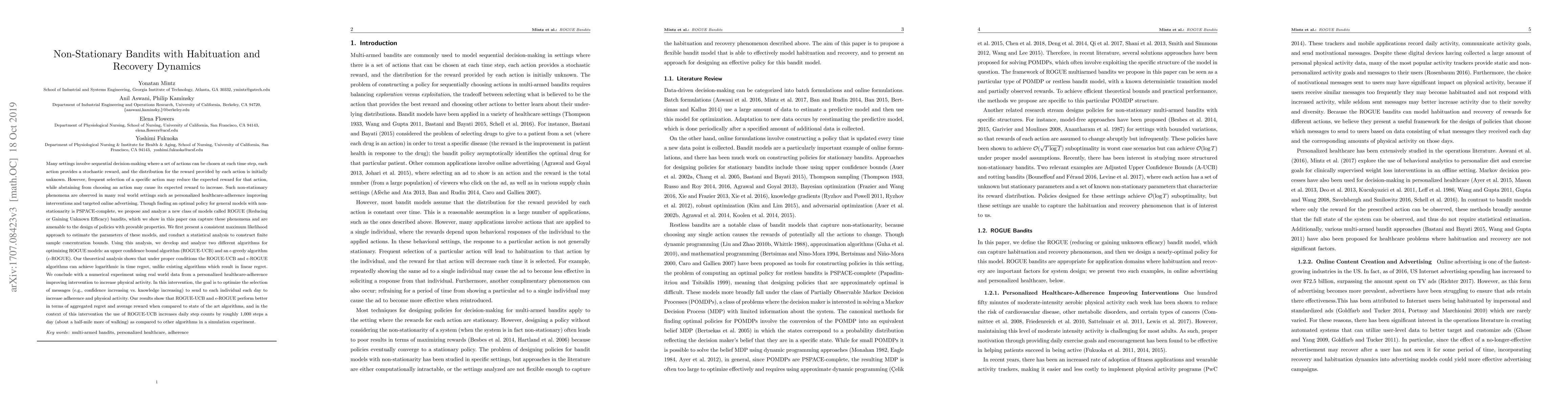 Many settings involve sequential decision-making where a set of actions can be chosen at each time step, each action provides a stochastic reward, and the distribution for the reward of each action is initially unknown. However, frequent selection of a specific action may reduce its expected reward, while abstaining from choosing an action may cause its expected reward to increase. Such non-stationary phenomena are observed in many real world settings such as personalized healthcare-adherence improving interventions and targeted online advertising. Though finding an optimal policy for general models with non-stationarity is PSPACE-complete, we propose and analyze a new class of models called ROGUE (Reducing or Gaining Unknown Efficacy) bandits, which we show in this paper can capture these phenomena and are amenable to the design of effective policies. We first present a consistent maximum likelihood estimator for the parameters of these models. Next, we construct finite sample concentration bounds that lead to an upper confidence bound policy called the ROGUE Upper Confidence Bound (ROGUE-UCB) algorithm. We prove that under proper conditions the ROGUE-UCB algorithm achieves logarithmic in time regret, unlike existing algorithms which result in linear regret. We conclude with a numerical experiment using real data from a personalized healthcare-adherence improving intervention to increase physical activity. In this intervention, the goal is to optimize the selection of messages (e.g., confidence increasing vs. knowledge increasing) to send to each individual each day to increase adherence and physical activity. Our results show that ROGUE-UCB performs better in terms of regret and average reward as compared to state of the art algorithms, and the use of ROGUE-UCB increases daily step counts by roughly 1,000 steps a day (about a half-mile more of walking) as compared to other algorithms.
