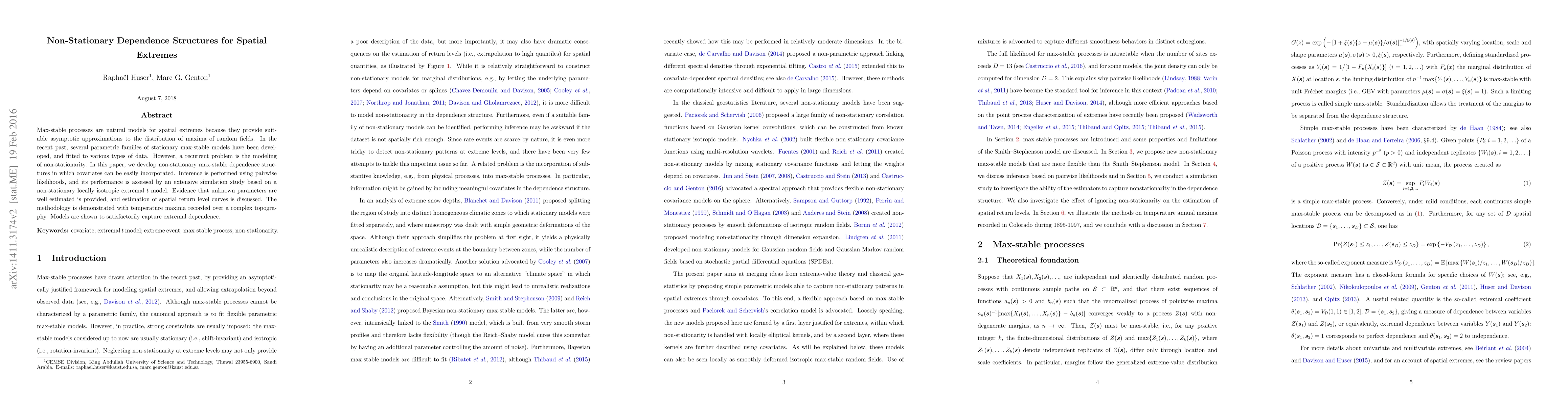 This paper develops non-stationary max-stable models to better capture spatial extremes, incorporating covariates through pairwise likelihoods. The methodology is validated via simulation and demonstrated on temperature maxima data, showing effective estimation of extremal dependence.