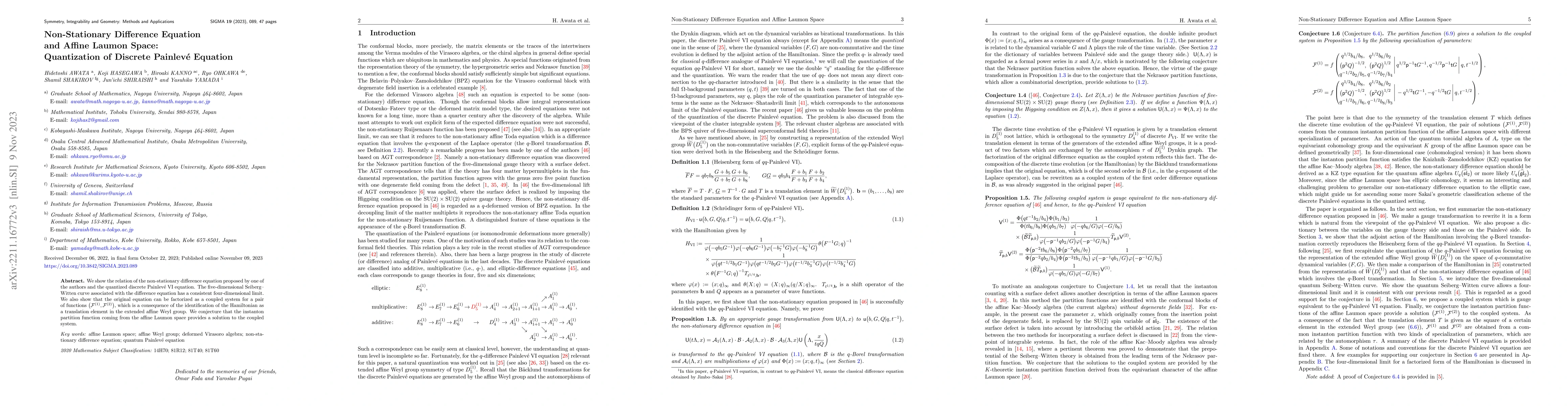 This paper establishes a connection between a non-stationary difference equation and the quantized discrete Painlevé VI equation, demonstrating that the associated five-dimensional Seiberg-Witten curve has a consistent four-dimensional limit. The authors propose a factorization of the original equation into a coupled system, and conjecture that the instanton partition function from affine Laumon space solves this system.