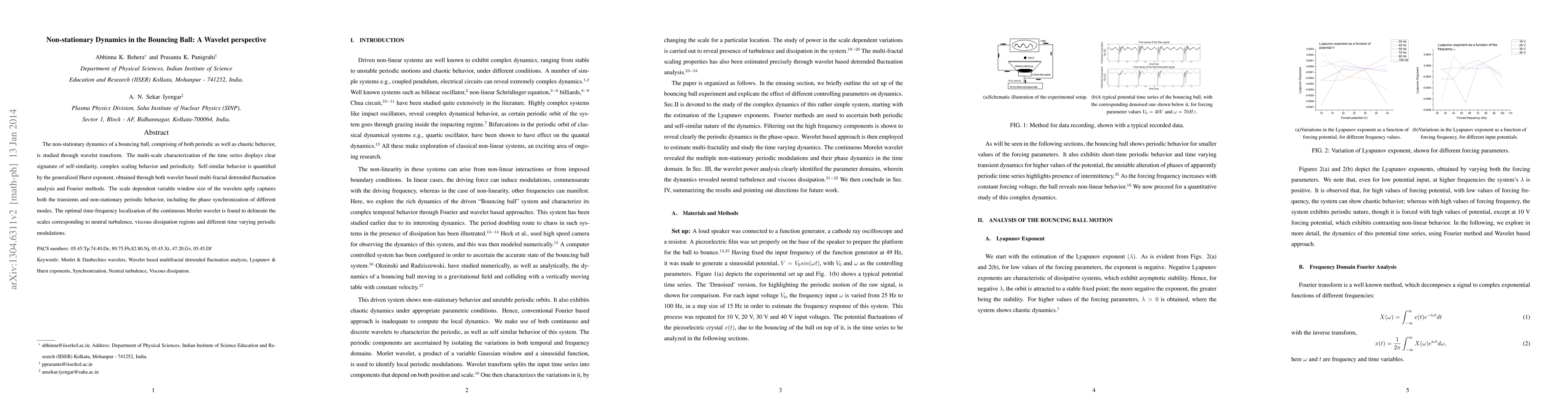 The non-stationary dynamics of a bouncing ball, comprising of both periodic as well as chaotic behavior, is studied through wavelet transform. The multi-scale characterization of the time series displays clear signature of self-similarity, complex scaling behavior and periodicity. Self-similar behavior is quantified by the generalized Hurst exponent, obtained through both wavelet based multi-fractal detrended fluctuation analysis and Fourier methods. The scale dependent variable window size of the wavelets aptly captures both the transients and non-stationary periodic behavior, including the phase synchronization of different modes. The optimal time-frequency localization of the continuous Morlet wavelet is found to delineate the scales corresponding to neutral turbulence, viscous dissipation regions and different time varying periodic modulations.