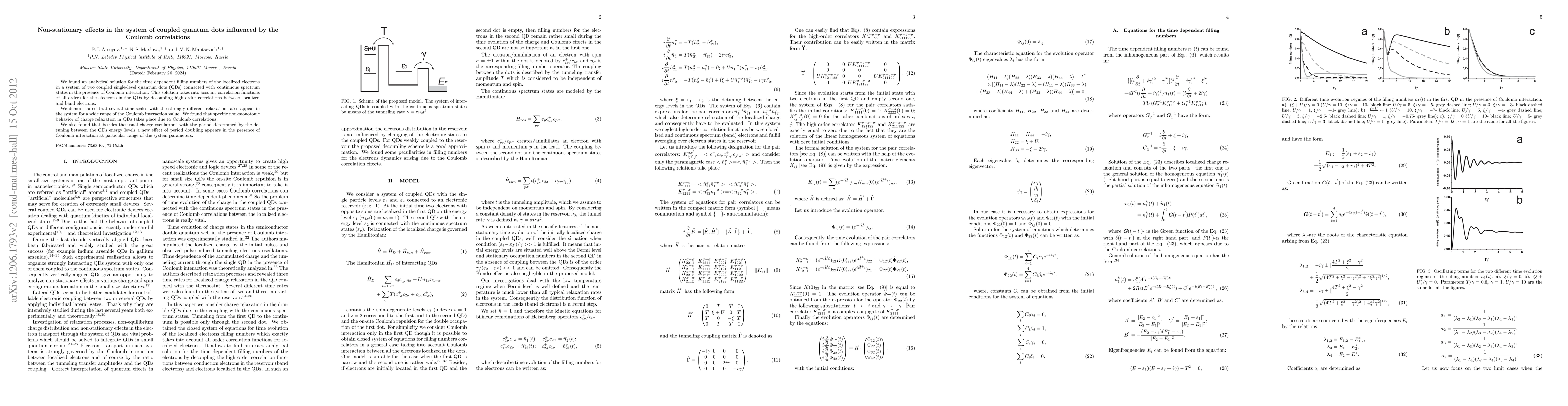 This paper presents an analytical solution for the time evolution of electron density in coupled quantum dots, revealing non-monotonic charge relaxation and period doubling effects due to Coulomb correlations, alongside multiple time scales with distinct relaxation rates.