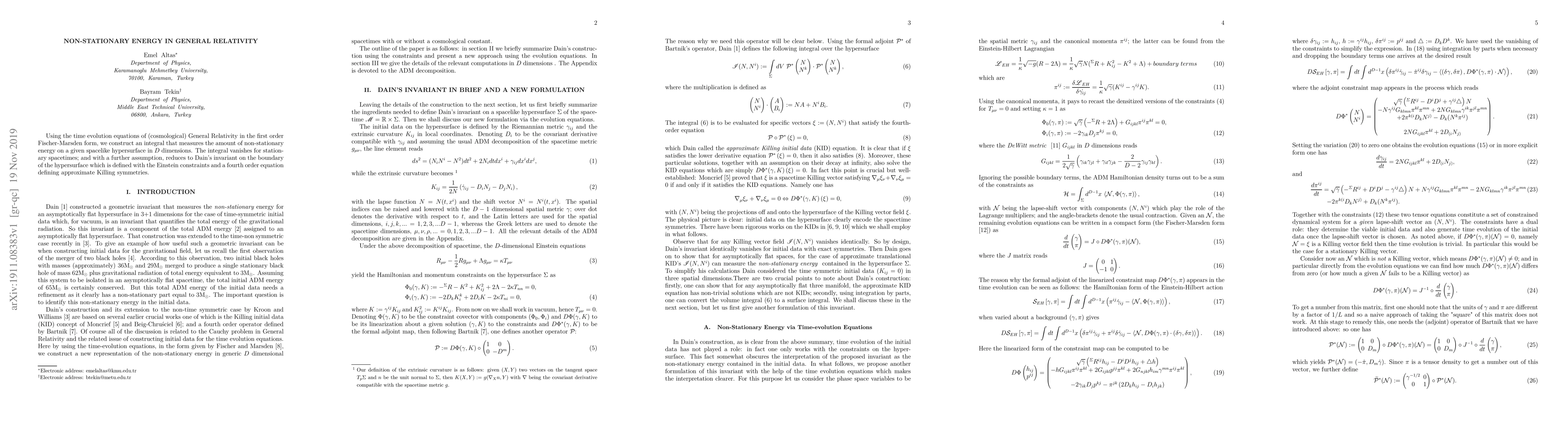 Using the time evolution equations of (cosmological) General Relativity in the first order Fischer-Marsden form, we construct an integral that measures the amount of non-stationary energy on a given spacelike hypersurface in $D$ dimensions. The integral vanishes for stationary spacetimes; and with a further assumption, reduces to Dain's invariant on the boundary of the hypersurface which is defined with the Einstein constraints and a fourth order equation defining approximate Killing symmetries.