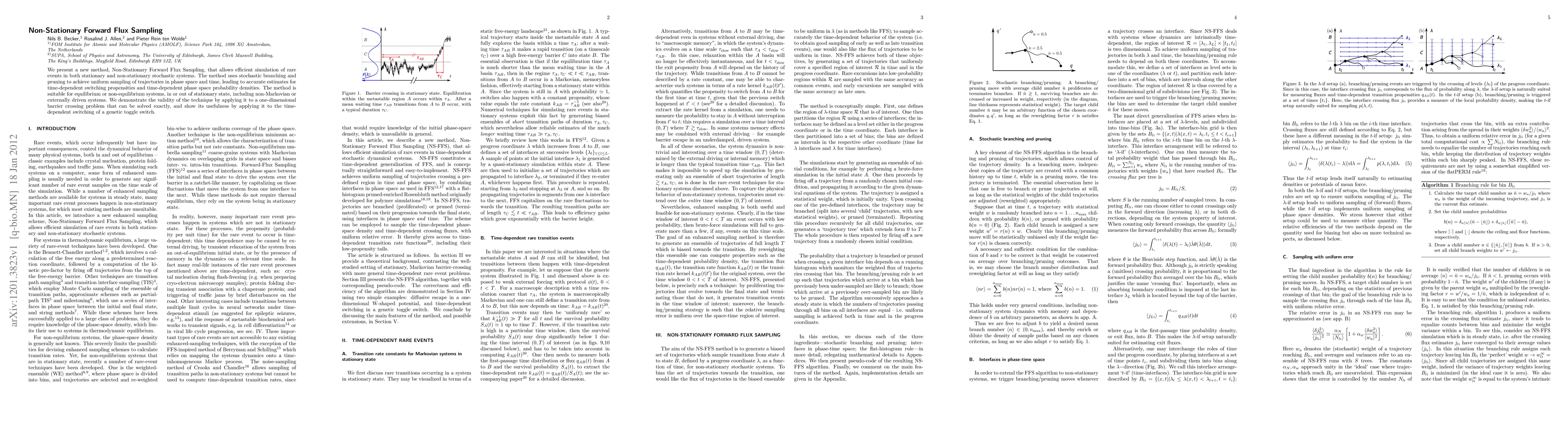 Non-Stationary Forward Flux Sampling (NSFFS) is a new method for efficiently simulating rare events in stochastic systems, both stationary and non-stationary. It employs stochastic branching and pruning to achieve uniform sampling, providing accurate estimates for time-dependent switching propensities and phase space probability densities.