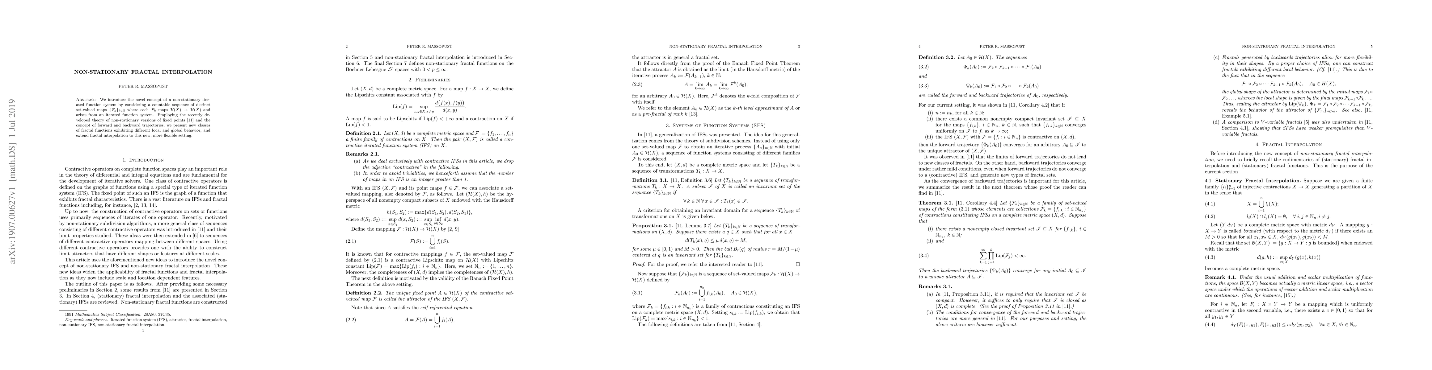 We introduce the novel concept of a non-stationary iterated function system by considering a countable sequence of distinct set-valued maps $\{\mathcal{F}_k\}_{k\in \mathbb{N}}$ where each $\mathcal{F}_k$ maps $\mathcal{H}(X)\to \mathcal{H}(X)$ and arises from an iterated function system. Employing the recently developed theory of non-stationary versions of fixed points [11] and the concept of forward and backward trajectories, we present new classes of fractal functions exhibiting different local and global behavior, and extend fractal interpolation to this new, more flexible setting.
