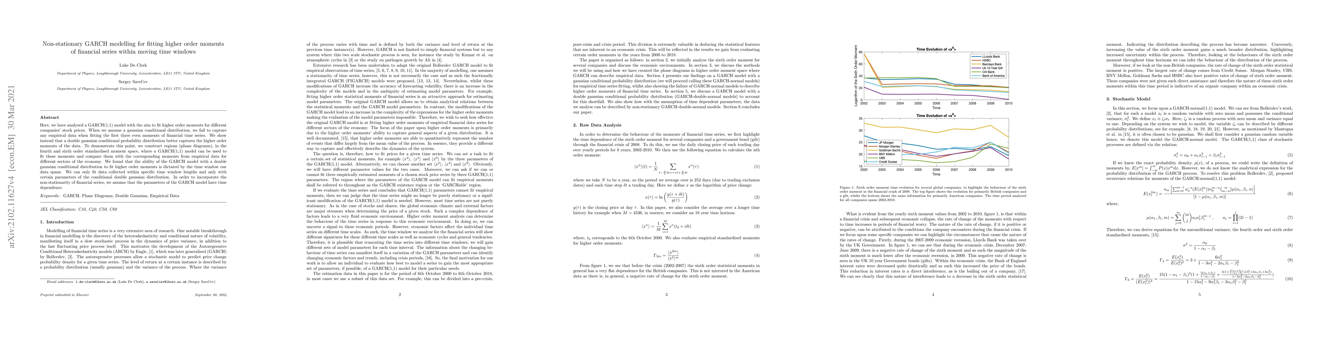 Here, we have analysed a GARCH(1,1) model with the aim to fit higher order moments for different companies' stock prices. When we assume a gaussian conditional distribution, we fail to capture any empirical data when fitting the first three even moments of financial time series. We show instead that a double gaussian conditional probability distribution better captures the higher order moments of the data. To demonstrate this point, we construct regions (phase diagrams), in the fourth and sixth order standardised moment space, where a GARCH(1,1) model can be used to fit these moments and compare them with the corresponding moments from empirical data for different sectors of the economy. We found that the ability of the GARCH model with a double gaussian conditional distribution to fit higher order moments is dictated by the time window our data spans. We can only fit data collected within specific time window lengths and only with certain parameters of the conditional double gaussian distribution. In order to incorporate the non-stationarity of financial series, we assume that the parameters of the GARCH model have time dependence.