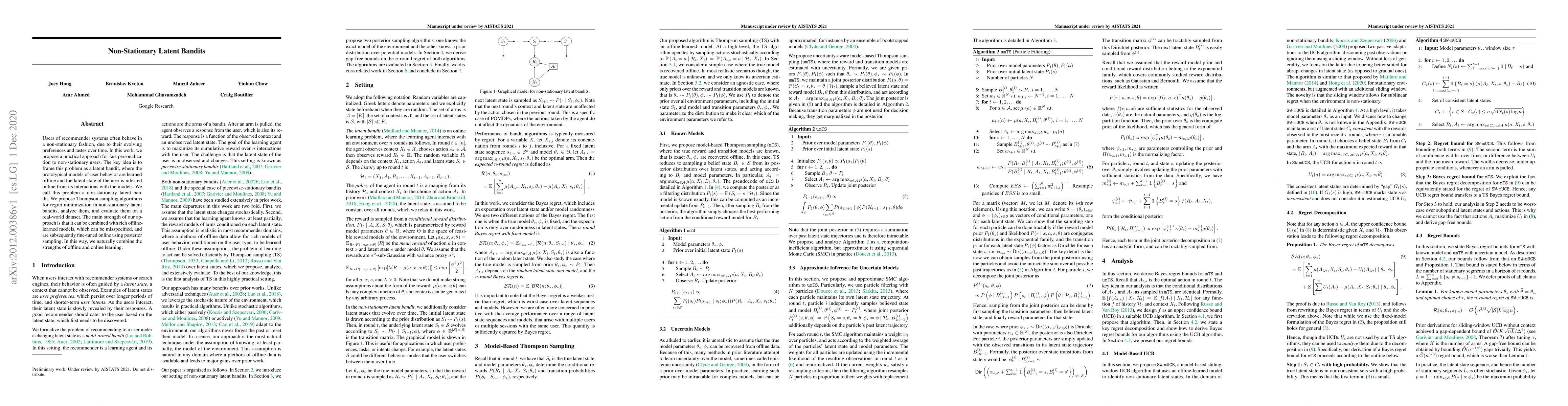 This paper proposes a Thompson sampling algorithm for non-stationary latent bandits to personalize recommender systems for users with changing preferences. The approach leverages offline-learned models and infers user states online, combining offline and online learning strengths.