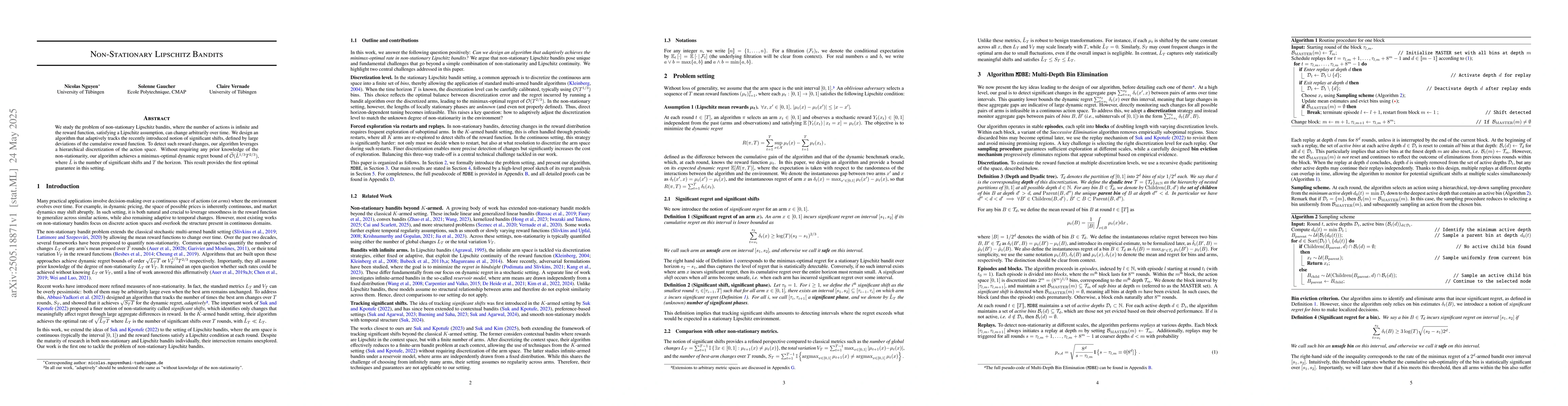 Provides the first minimax-optimal guarantee for non-stationary Lipschitz bandits, distinguishing it from previous work that either assumed stationarity or had suboptimal bounds.