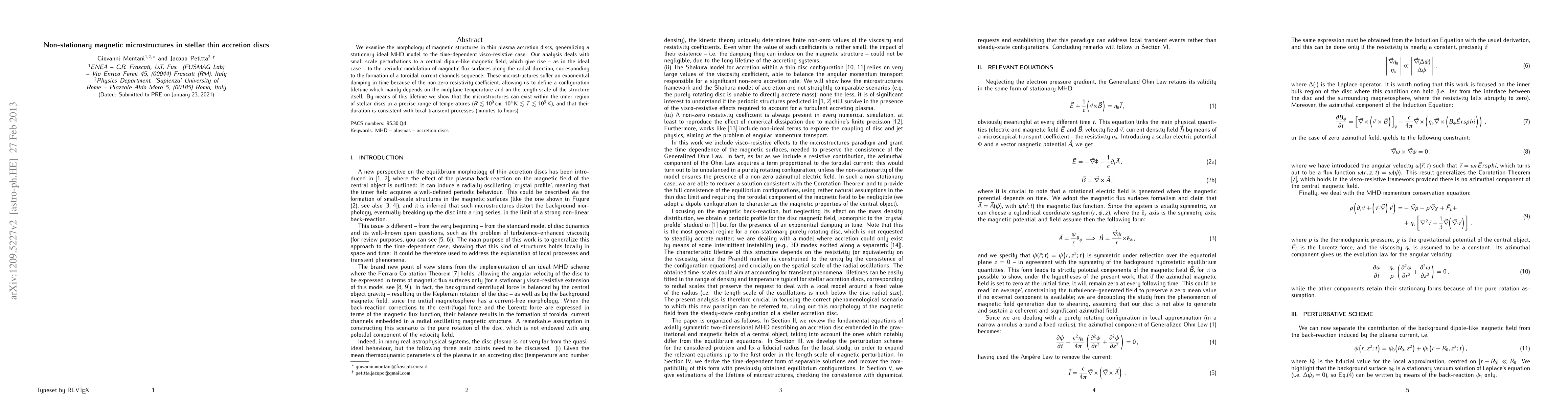 We examine the morphology of magnetic structures in thin plasma accretion discs, generalizing a stationary ideal MHD model to the time-dependent visco-resistive case. Our analysis deals with small scale perturbations to a central dipole-like magnetic field, which give rise -- as in the ideal case -- to the periodic modulation of magnetic flux surfaces along the radial direction, corresponding to the formation of a toroidal current channels sequence. These microstructures suffer an exponential damping in time because of the non-zero resistivity coefficient, allowing us to define a configuration lifetime which mainly depends on the midplane temperature and on the length scale of the structure itself. By means of this lifetime we show that the microstructures can exist within the inner region of stellar discs in a precise range of temperatures, and that their duration is consistent with local transient processes (minutes to hours).