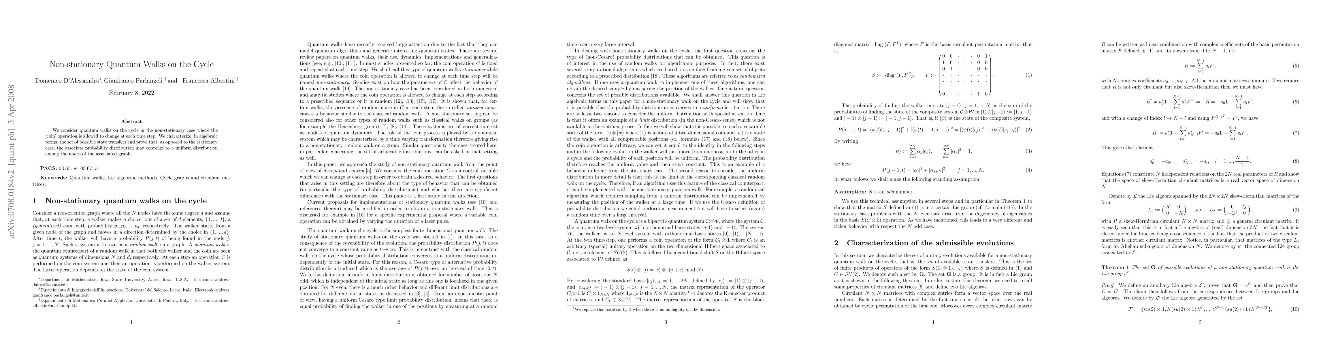 This paper explores non-stationary quantum walks on a cycle, where the coin operator changes per step. It reveals that unlike stationary walks, one can achieve an asymptotically uniform distribution across the graph's nodes, characterized algebraically.