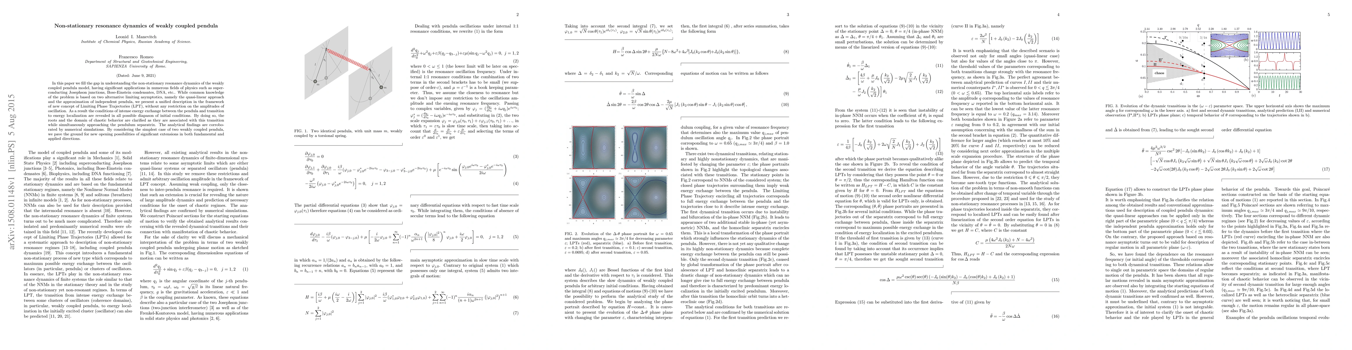 This paper explores the non-stationary resonance dynamics of weakly coupled pendula using a unified framework of Limiting Phase Trajectories (LPT), revealing conditions for energy exchange and localization, and clarifying chaotic behavior without amplitude restrictions. Analytical findings are supported by numerical simulations.