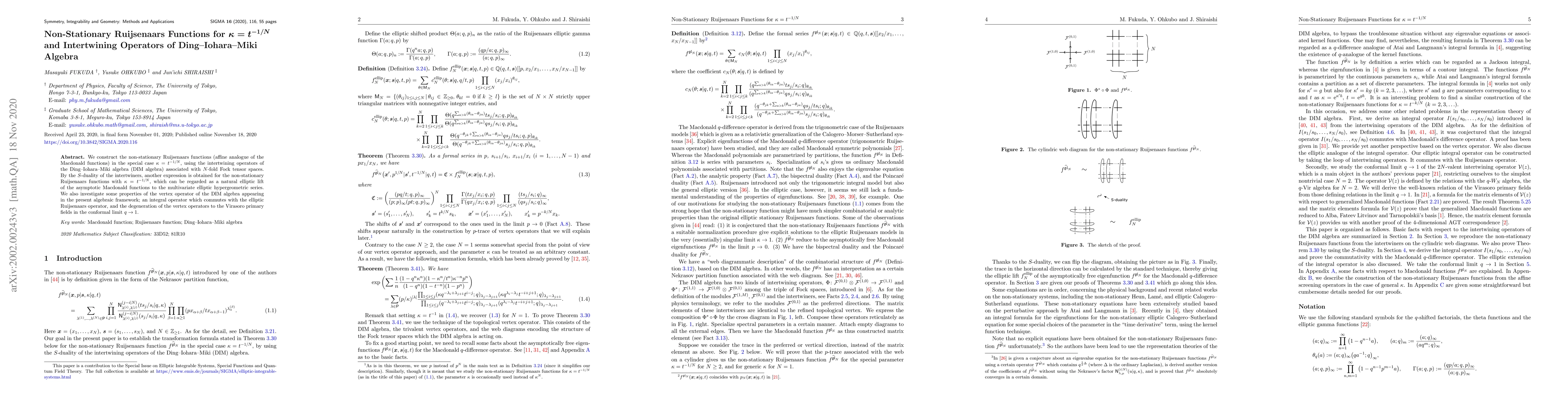 This paper constructs non-stationary Ruijsenaars functions for $\kappa=t^{-1/N}$ using intertwining operators from the Ding-Iohara-Miki algebra, revealing an elliptic lift of asymptotic Macdonald functions. It also explores properties of the vertex operator in this algebraic framework, including its commutation with the elliptic Ruijsenaars operator and its degeneration to Virasoro primary fields.