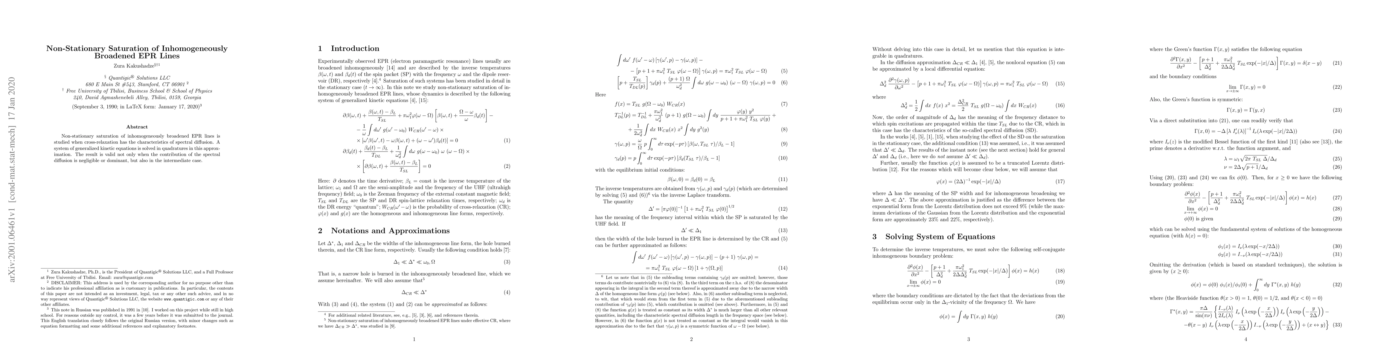 This paper investigates non-stationary saturation effects in inhomogeneously broadened EPR lines under spectral diffusion-like cross-relaxation. A system of generalized kinetic equations is solved to provide results valid across all regimes, from negligible to dominant spectral diffusion contributions.