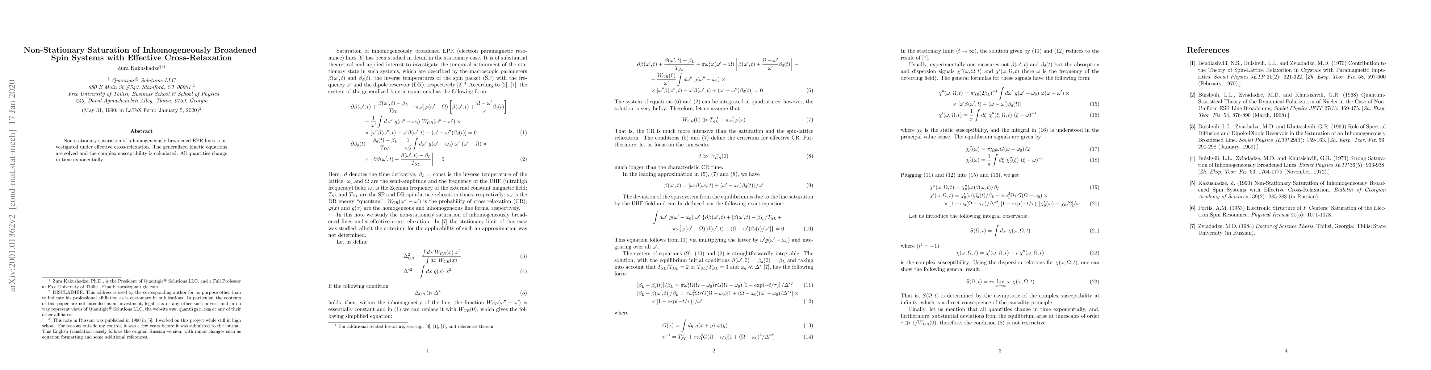 Non-stationary saturation of inhomogeneously broadened EPR lines is investigated under effective cross-relaxation. The generalized kinetic equations are solved and the complex susceptibility is calculated. All quantities change in time exponentially.