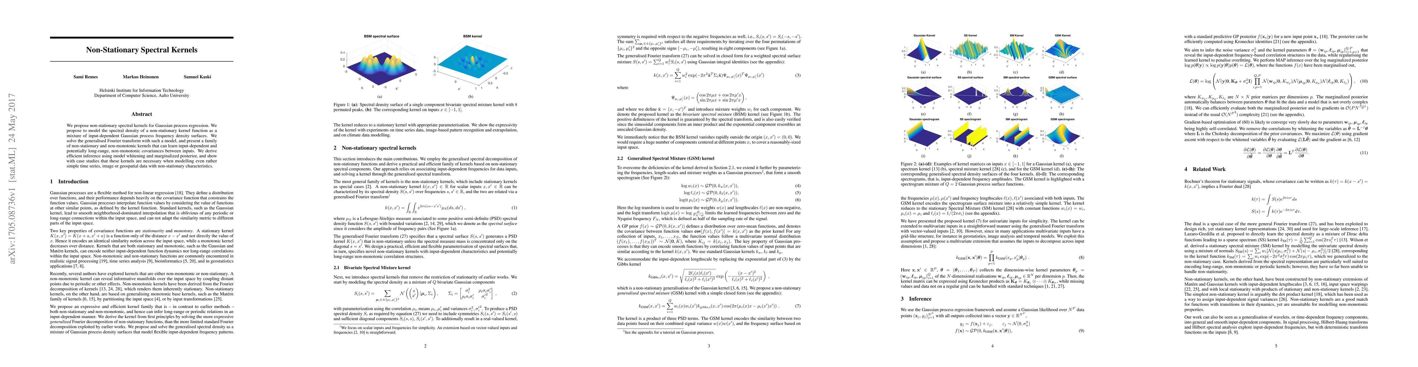 This paper introduces non-stationary spectral kernels for Gaussian process regression, modeling the spectral density as a mixture of input-dependent Gaussian processes. The proposed kernels can learn non-monotonic, long-range covariances and are shown to be effective for time series, image, and geospatial data with non-stationary characteristics.