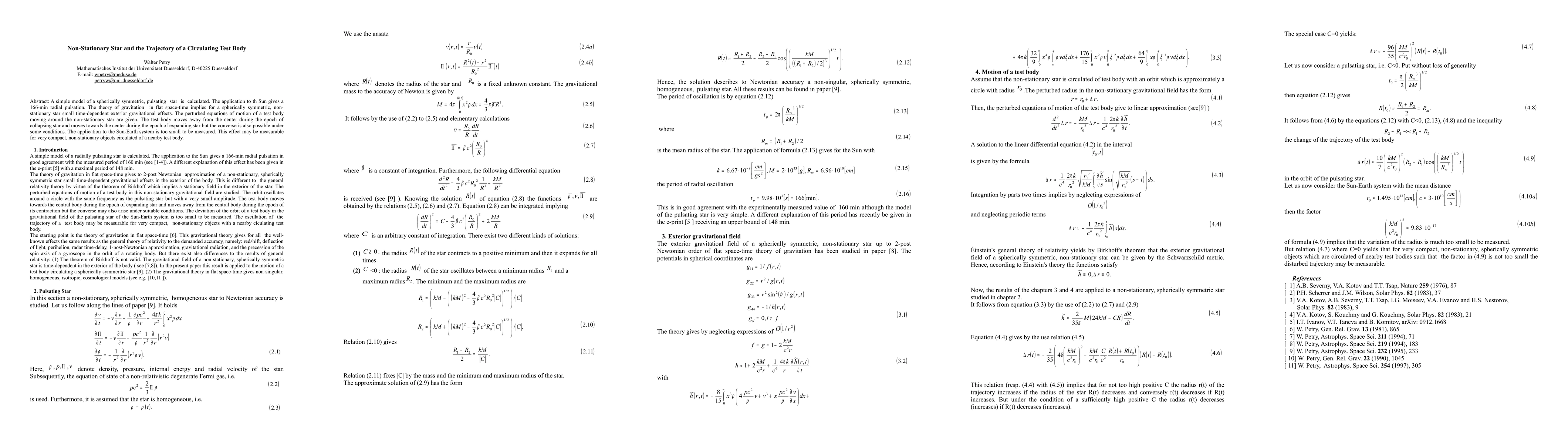 A simple model of a spherically symmetric, pulsating star is calculated. The application to the Sun gives a 166-min radial pulsation. The theory of gravitation in flat space-time implies for a spherically symmetric, nonstationary star small time-dependent exterior gravitational effects. The perturbed equations of motion of a test body moving around the non-stationary star are given. The test body moves away from the center during the epoch of collapsing star and moves towards the center during the epoch of expanding star but the converse is also possible under some conditions. The application to the Sun-Earth system is too small to be measured. This effect may be measurable for very compact, non-stationary objects circulated of a nearby test body.