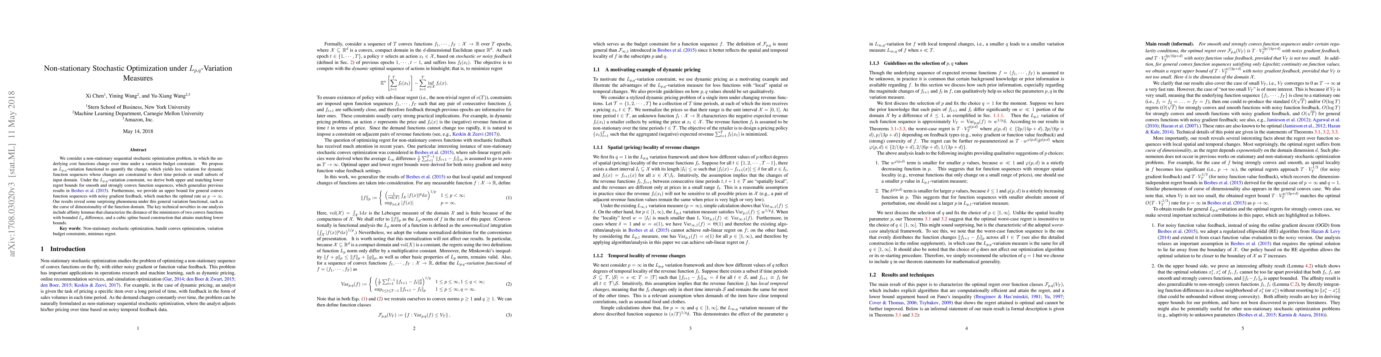 We consider a non-stationary sequential stochastic optimization problem, in which the underlying cost functions change over time under a variation budget constraint. We propose an $L_{p,q}$-variation functional to quantify the change, which yields less variation for dynamic function sequences whose changes are constrained to short time periods or small subsets of input domain. Under the $L_{p,q}$-variation constraint, we derive both upper and matching lower regret bounds for smooth and strongly convex function sequences, which generalize previous results in Besbes et al. (2015). Furthermore, we provide an upper bound for general convex function sequences with noisy gradient feedback, which matches the optimal rate as $p\to\infty$. Our results reveal some surprising phenomena under this general variation functional, such as the curse of dimensionality of the function domain. The key technical novelties in our analysis include affinity lemmas that characterize the distance of the minimizers of two convex functions with bounded Lp difference, and a cubic spline based construction that attains matching lower bounds.