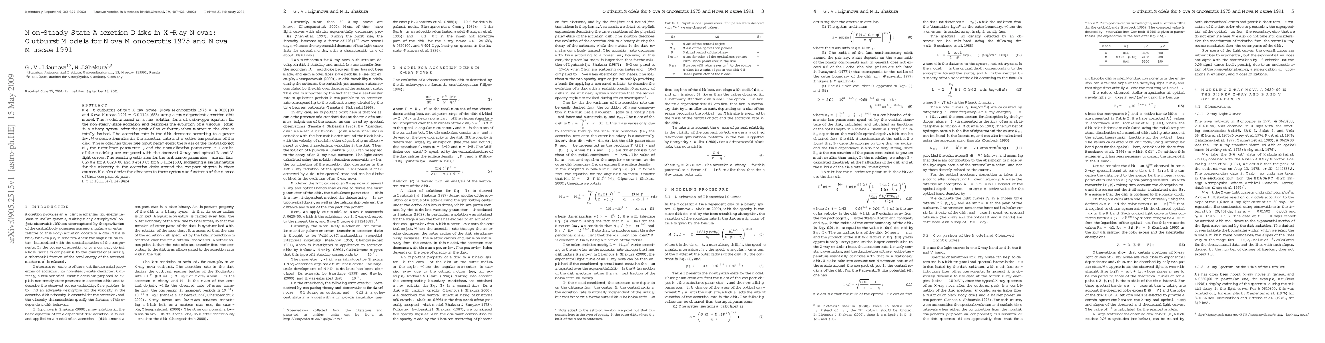 We fit outbursts of two X-ray novae (Nova Monocerotis 1975=A0620-00 and Nova Muscae GS 1991=1124-683) using a time-dependent accretion disk model. The model is based on a new solution for a diffusion-type equation for the non-steady-state accretion and describes the evolution of a viscous alpha-disk in a binary system after the peak of an outburst, when matter in the disk is totally ionized. The accretion rate in the disk decreases according to a power law. We derive formulas for the accretion rate and effective temperature of the disk. The model has three free input parameters: the mass of the central object M, the turbulence parameter alpha, and the normalization parameter delta t. Results of the modeling are compared with the observed X-ray and optical B and V light curves. The resulting estimates for the turbulence parameter $\alpha$ are similar: 0.2-0.4 for A 0620-00 and 0.45-0.65 for GS 1124-683, suggesting a similar nature for the viscosity in the accretion disks around the compact objects in these sources. We also derive the distances to these systems as functions of the masses of their compact objects.