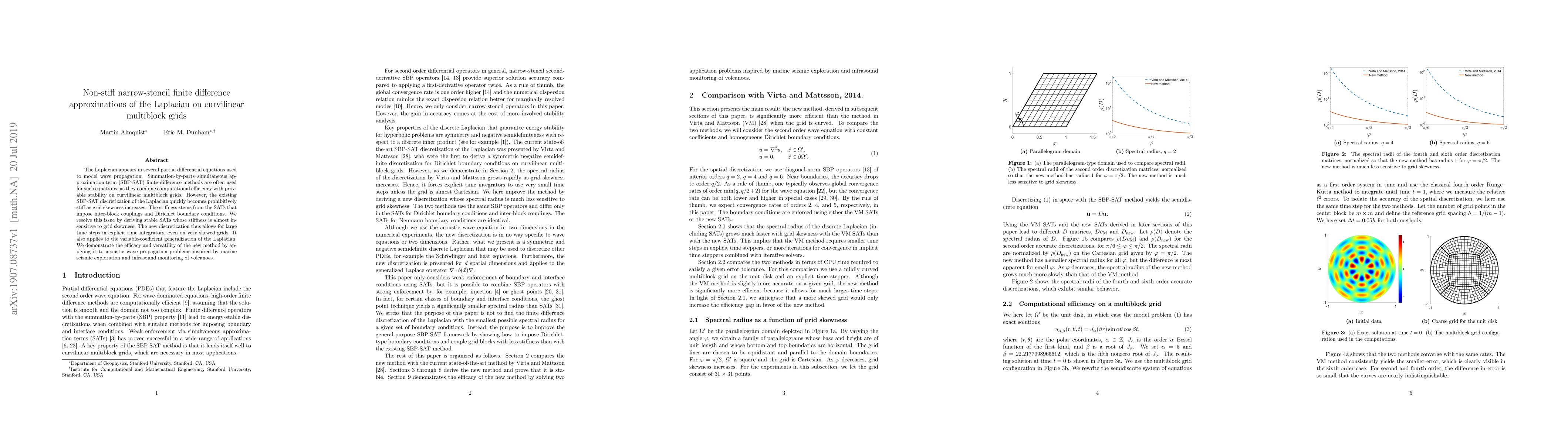This paper proposes a non-stiff, narrow-stencil finite difference method for the Laplacian on curvilinear multiblock grids, addressing the stiffness issue in existing SBP-SAT methods. The new method enables large time steps in explicit time integrators, even for highly skewed grids, and is demonstrated through applications in marine seismic and volcano infrasound monitoring.