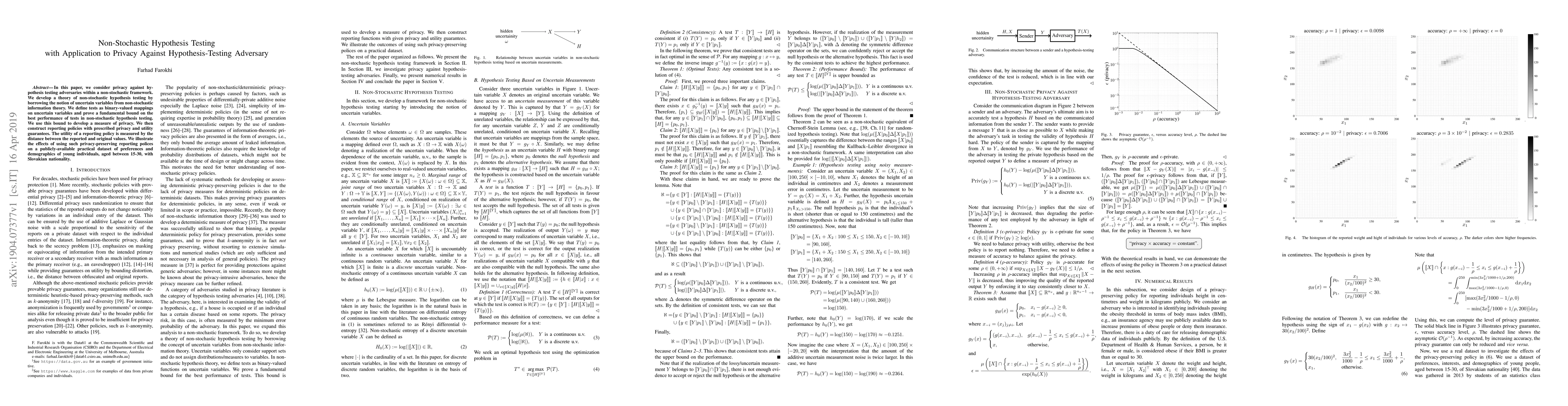 This paper develops a non-stochastic hypothesis testing framework to address privacy against adversaries who test hypotheses. It establishes a fundamental bound on test performance and uses it to create privacy-preserving reporting policies that balance privacy with utility, measured by the fidelity of reported data.
