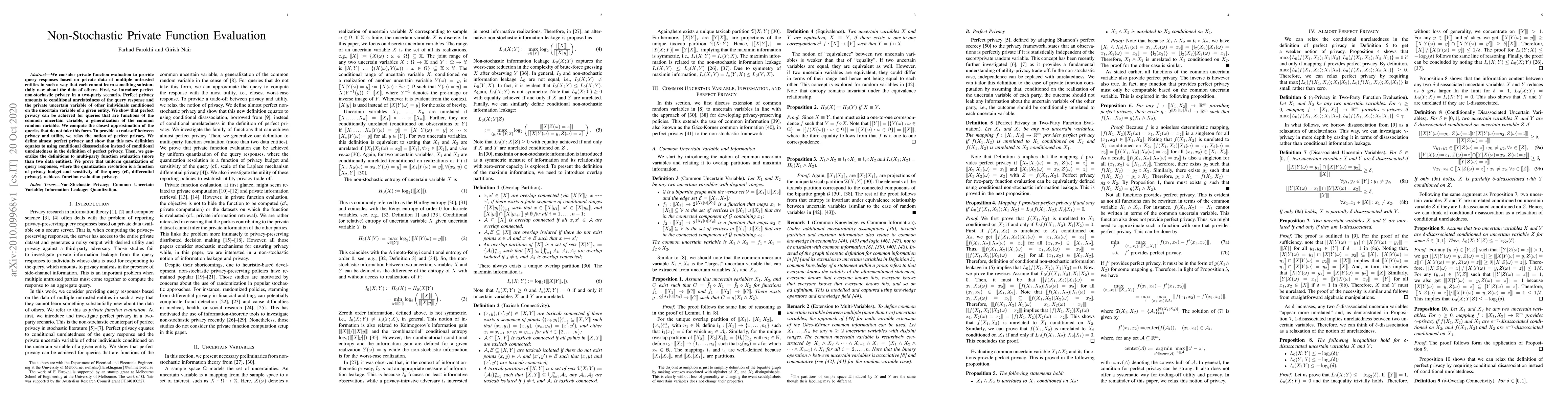 We consider private function evaluation to provide query responses based on private data of multiple untrusted entities in such a way that each cannot learn something substantially new about the data of others. First, we introduce perfect non-stochastic privacy in a two-party scenario. Perfect privacy amounts to conditional unrelatedness of the query response and the private uncertain variable of other individuals conditioned on the uncertain variable of a given entity. We show that perfect privacy can be achieved for queries that are functions of the common uncertain variable, a generalization of the common random variable. We compute the closest approximation of the queries that do not take this form. To provide a trade-off between privacy and utility, we relax the notion of perfect privacy. We define almost perfect privacy and show that this new definition equates to using conditional disassociation instead of conditional unrelatedness in the definition of perfect privacy. Then, we generalize the definitions to multi-party function evaluation (more than two data entities). We prove that uniform quantization of query responses, where the quantization resolution is a function of privacy budget and sensitivity of the query (cf., differential privacy), achieves function evaluation privacy.