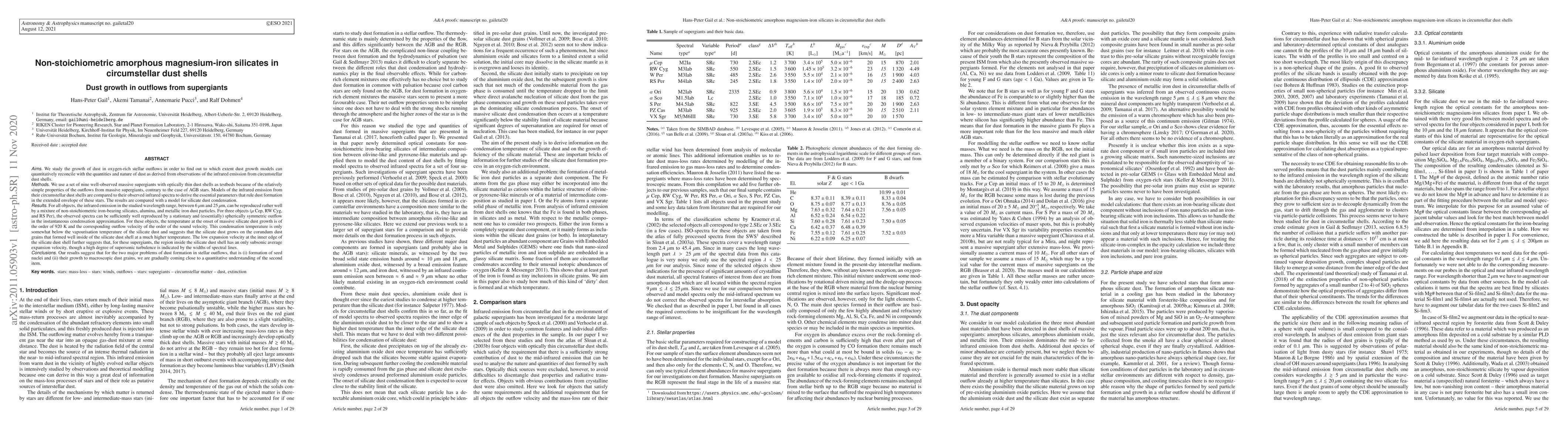 This research investigates dust formation in the circumstellar shells of nine massive supergiants, finding that non-stoichiometric iron-bearing silicates best match observed infrared spectra. The study suggests that silicate dust formation occurs at temperatures around 920 K, indicating growth on pre-existing corundum grains, and provides insights into the mechanisms of dust grain formation in stellar outflows.