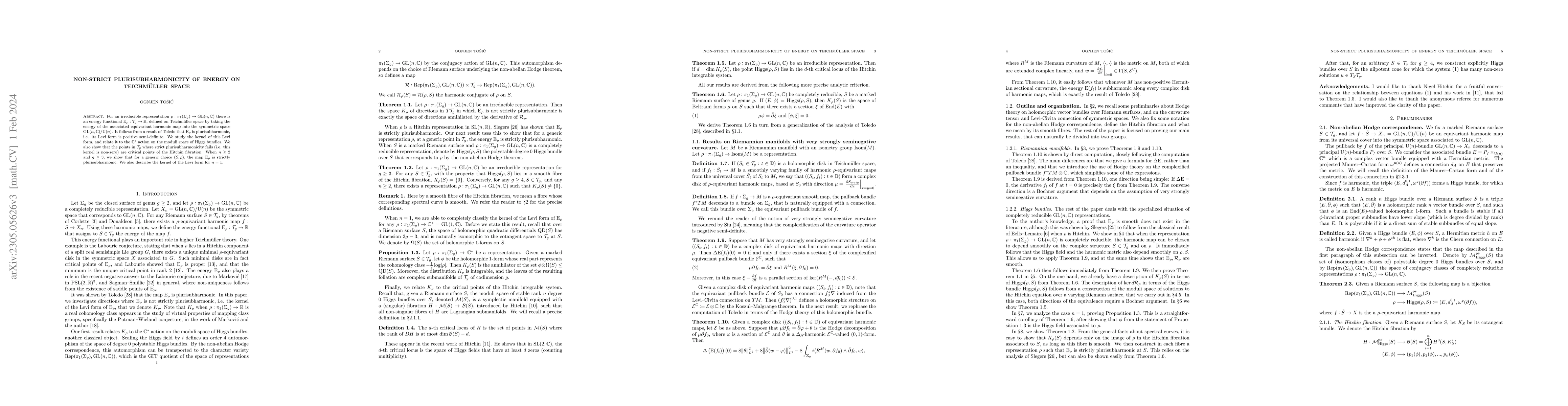 This paper investigates the energy functional $\mathrm{E}_\rho$ on Teichmüller space, showing that it is plurisubharmonic but not strictly so at certain critical points. It demonstrates that strict plurisubharmonicity holds for generic representations when $n\geq 2$ and $g\geq 3$.