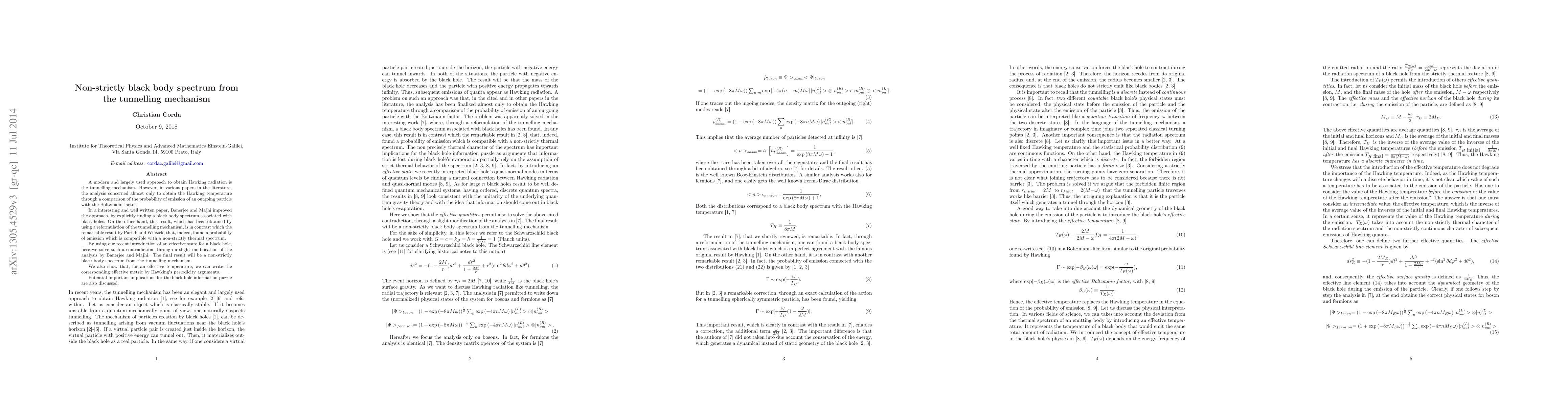 A modern and largely used approach to obtain Hawking radiation is the tunnelling mechanism. However, in various papers in the literature, the analysis concerned almost only to obtain the Hawking temperature through a comparison of the probability of emission of an outgoing particle with the Boltzmann factor. In a interesting and well written paper, Banerjee and Majhi improved the approach, by explicitly finding a black body spectrum associated with black holes. On the other hand, this result, which has been obtained by using a reformulation of the tunnelling mechanism, is in contrast which the remarkable result by Parikh and Wilczek, that, indeed, found a probability of emission which is compatible with a non-strictly thermal spectrum. By using our recent introduction of an effective state for a black hole, here we solve such a contradiction, through a slight modification of the analysis by Banerjee and Majhi. The final result will be a non-strictly black body spectrum from the tunnelling mechanism. We also show that, for an effective temperature, we can write the corresponding effective metric by Hawking's periodicity arguments. Potential important implications for the black hole information puzzle are also discussed