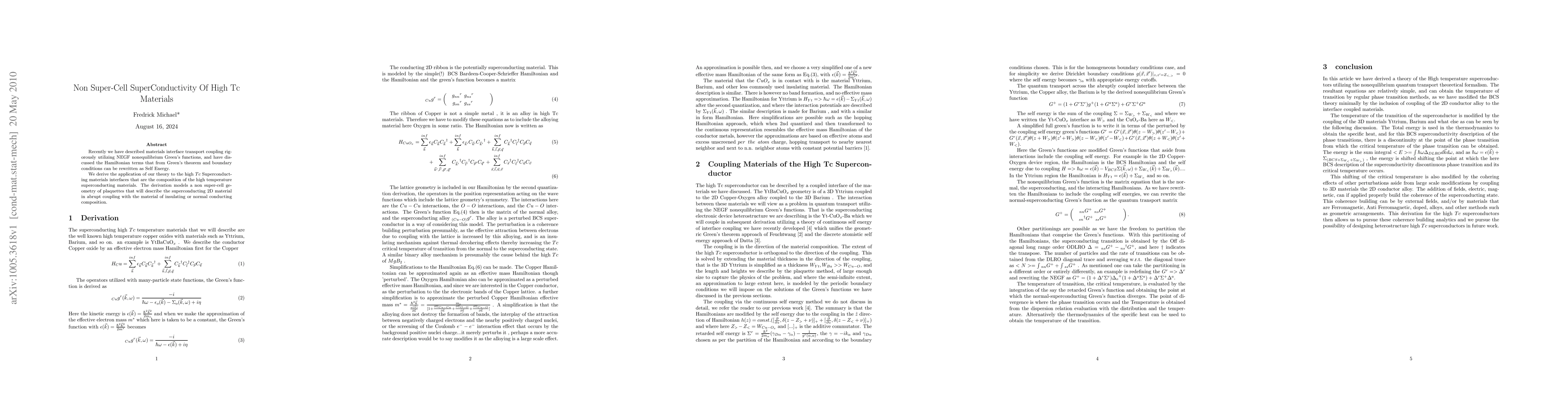 Recently we have described materials interface transport coupling rigorously utilizing NEGF nonequilibrium Green's functions, and have discussed the Hamiltonian terms that from Green's theorem and boundary conditions can be rewritten as Self Energy. We derive the application of our theory to the high $Tc$ Superconducting materials interfaces that are the composition of the high temperature superconducting materials. The derivation models a non super-cell geometry of plaquettes that will describe the superconducting 2D material in abrupt coupling with the material of insulating or normal conducting composition.