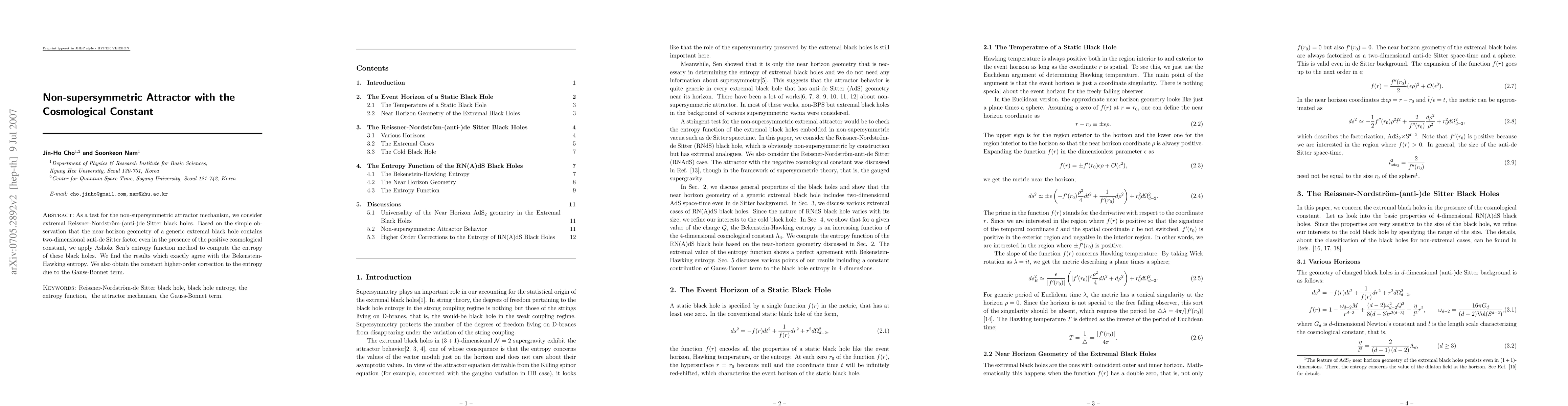 As a test for the non-supersymmetric attractor mechanism, we consider extremal Reissner-Nordstr\"{o}m-(anti-)de Sitter black holes. Based on the simple observation that the near-horizon geometry of a generic extremal black hole contains two-dimensional anti-de Sitter factor even in the presence of the positive cosmological constant, we apply Ashoke Sen's entropy function method to compute the entropy of these black holes. We find the results which exactly agree with the Bekenstein-Hawking entropy. We also obtain the constant higher-order correction to the entropy due to the Gauss-Bonnet term.