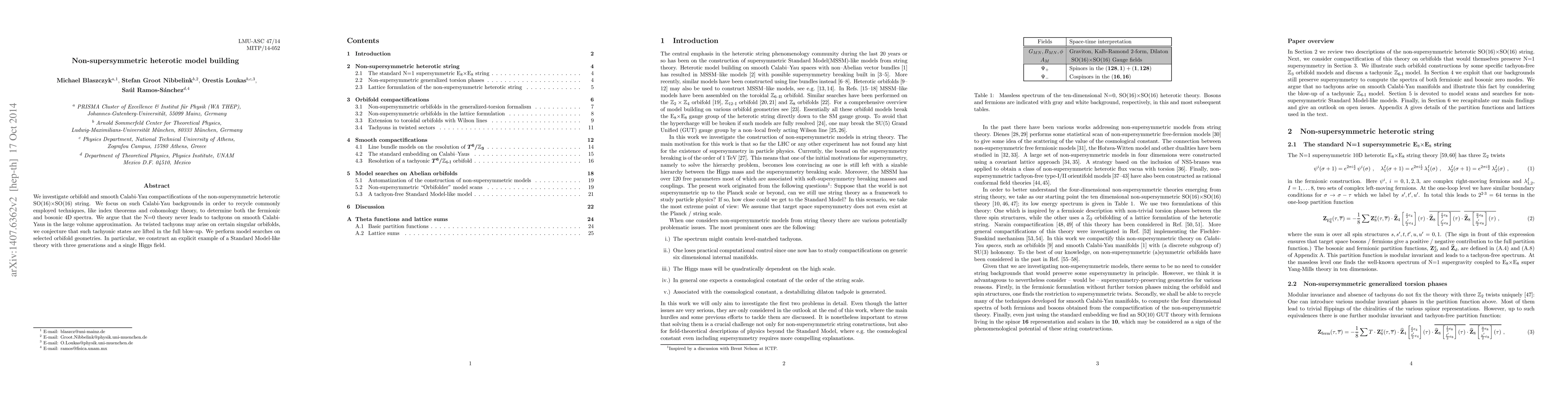 We investigate orbifold and smooth Calabi-Yau compactifications of the non-supersymmetric heterotic SO(16)xSO(16) string. We focus on such Calabi-Yau backgrounds in order to recycle commonly employed techniques, like index theorems and cohomology theory, to determine both the fermionic and bosonic 4D spectra. We argue that the N=0 theory never leads to tachyons on smooth Calabi-Yaus in the large volume approximation. As twisted tachyons may arise on certain singular orbifolds, we conjecture that such tachyonic states are lifted in the full blow-up. We perform model searches on selected orbifold geometries. In particular, we construct an explicit example of a Standard Model-like theory with three generations and a single Higgs field.