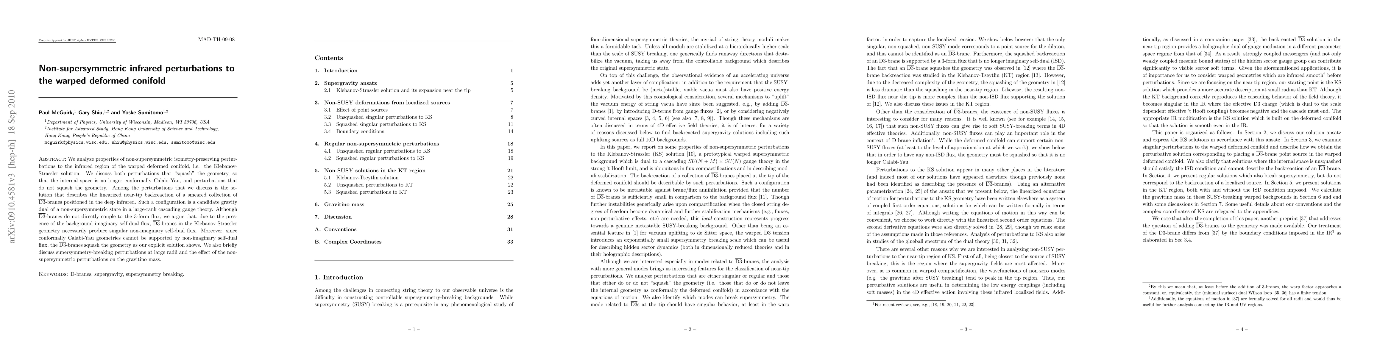 This paper investigates non-supersymmetric perturbations to the Klebanov-Strassler solution, focusing on how these changes squash the internal geometry and their implications for the duality between gravity and gauge theory. It finds that anti-D3-branes induce a non-conformal geometry through the production of singular non-imaginary self-dual flux.