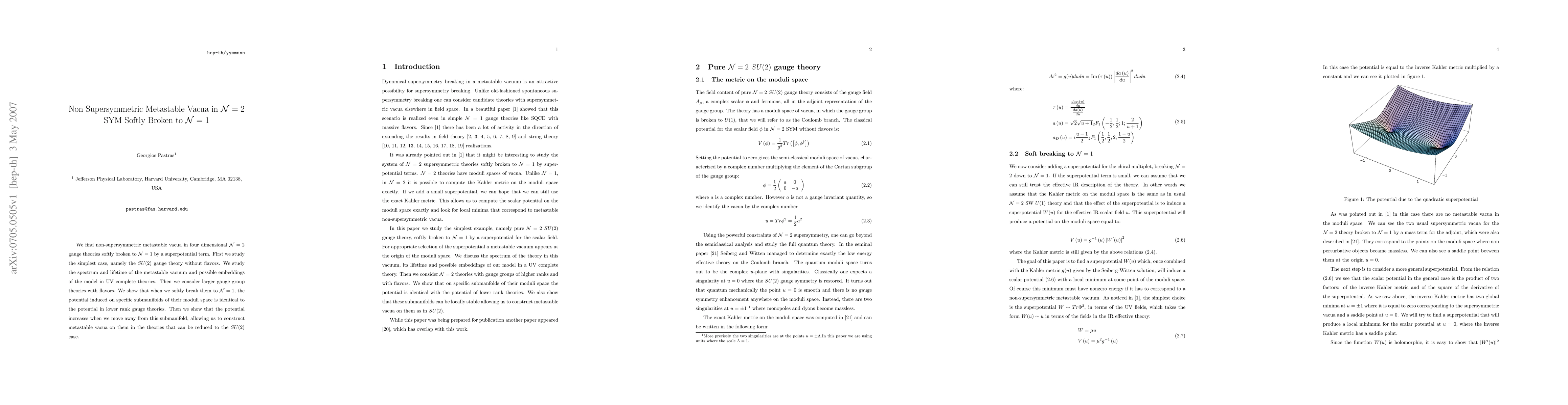 Summary: This paper investigates non-supersymmetric metastable vacua in four-dimensional N=2 supersymmetric gauge theories softly broken to N=1 by a superpotential term. It studies the simplest SU(2) case and explores the spectrum and lifetime of the metastable vacuum, then extends findings to larger gauge groups with flavors, showing consistent potential behavior across different theories.